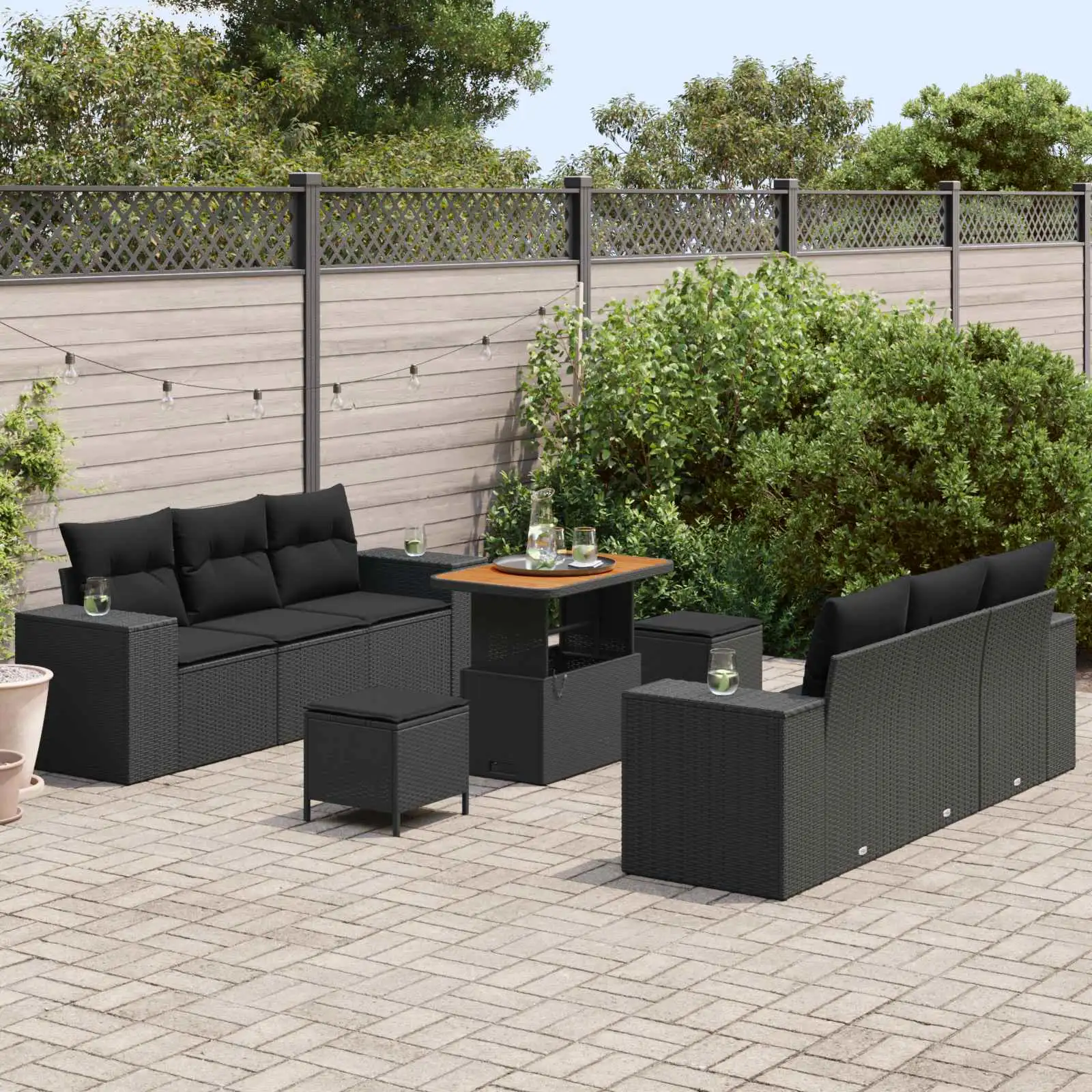 See 9-osaline modulaarne aiamööbli diivanikomplekt on praktiline lahendus, kui soovid luua terrassile või aeda ühtse ja mugava istumisala. Moodne ja tagasihoidlik disain sobitub kergesti eri stiilis väliruumidega ning must polürotang näeb esinduslik välja nii igapäevases kasutuses kui ka pidulikematel aiapidudel. Moodulite paigutust saab vastavalt vajadusele muuta, et luua hubane nurgadiivan, eraldiseisvad istumiskohad või avatum lahendus suurematele seltskondadele, pakkudes 6 mugavat istekohta.