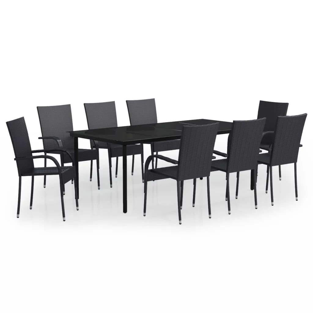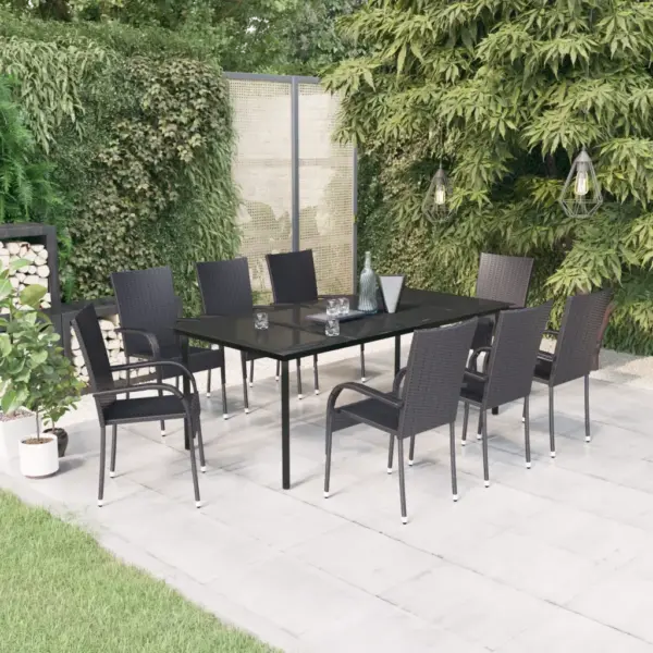 See 9-osaline must aiamööbli komplekt on praktiline lahendus pere ja sõpradega terrassil või aias einestamiseks. Suur klaasplaadiga laud ja kaheksa mugavat tooli loovad piisavalt ruumi ühisteks õhtusöökideks ning igapäevaseks puhkamiseks värskes õhus. Vastupidavad materjalid tagavad, et komplekt sobib hästi regulaarseks kasutamiseks välitingimustes.