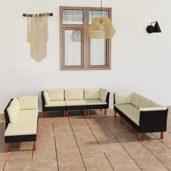 See 9-osaline must aiamööbli komplekt ühendab moodulse paigutusvabaduse, vastupidavad materjalid ja mugavad padjad. PE-rotang, terasraamid ja eukalüptipuidust jalad tagavad stabiilsuse, samas kui kreemjasvalged eemaldatavate katetega padjad pakuvad hubast istumiskogemust ning on lihtsasti hooldatavad.