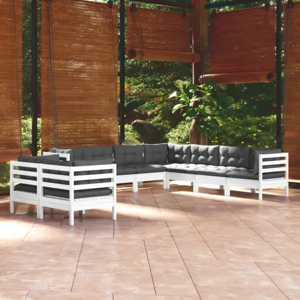 See 9-osaline aiamööbli komplekt loob sinu terrassile või aeda avara istumisala, kus nautida ilma, puhata või veeta aega pere ja sõpradega. Komplekt on valmistatud tugevast täismännipuidust ja täiendatud pehmete patjadega, pakkudes funktsionaalset ning modulaarset lahendust erinevatele õueruumidele.