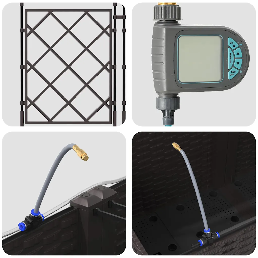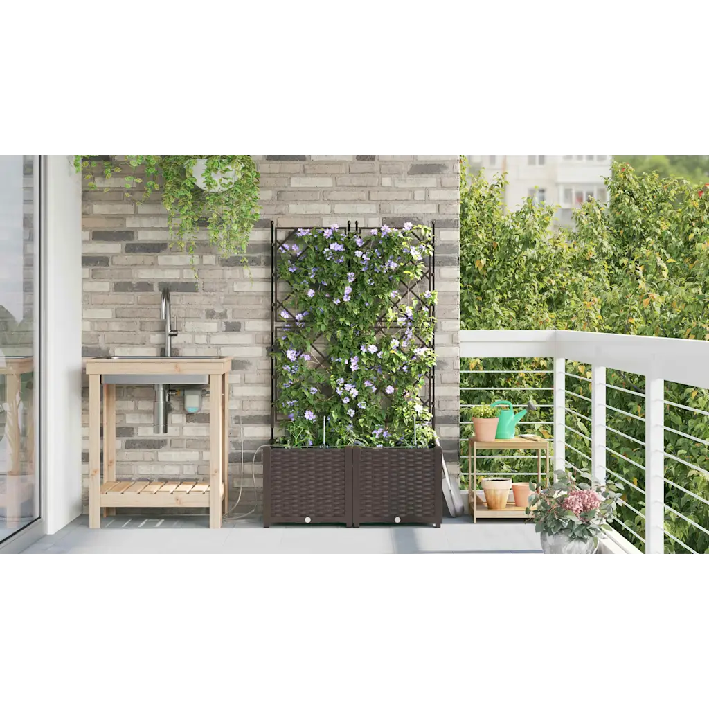 Kaheosaline pruunist terasest istutuskast trellisega on mõeldud ronitaimede ja muude dekoratiivtaimede kasvatamiseks aias, terrassil või rõdul. Integreeritud kastmissüsteem aitab hoida mulla ühtlaselt niiskena, luues taimedele sobivad kasvutingimused ka siis, kui oled mõnda aega kodust eemal. Tänu kaasaegsele disainile sobitub istutuskast erinevate väliruumide sisekujundusega.