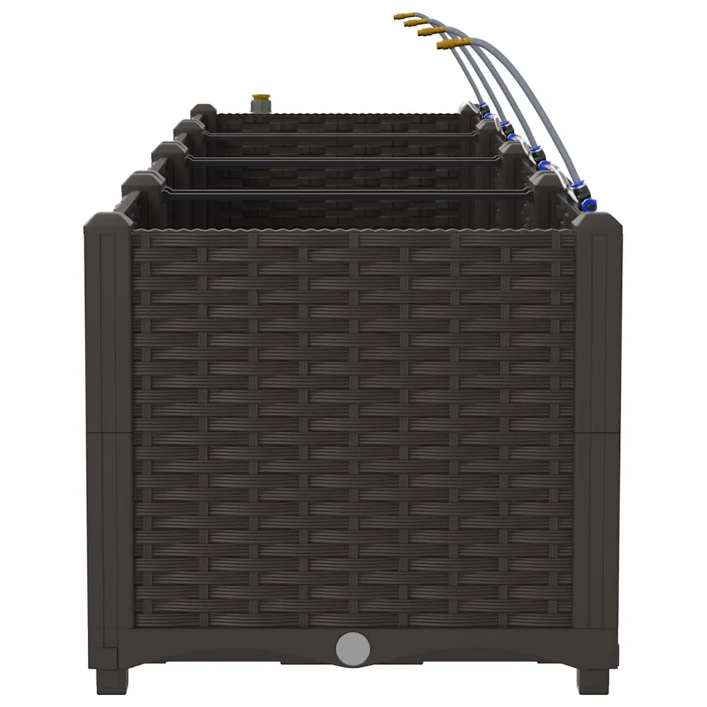 Need pruunid terasest aia istutuskastid loovad ühtse 160 cm laiuse istutusala, mis sobib hästi terrassile, rõdule või aeda. Vastupidav konstruktsioon ja integreeritud kastmissüsteem aitavad taimedel saada ühtlaselt niiskust, muutes komplekti praktiliseks lahenduseks nii kogenud kui ka alustavale aiapidajale. Kaasaegne välimus sulandub erinevate väliruumide stiilidega ning täiendab ümbritsevat haljastust.