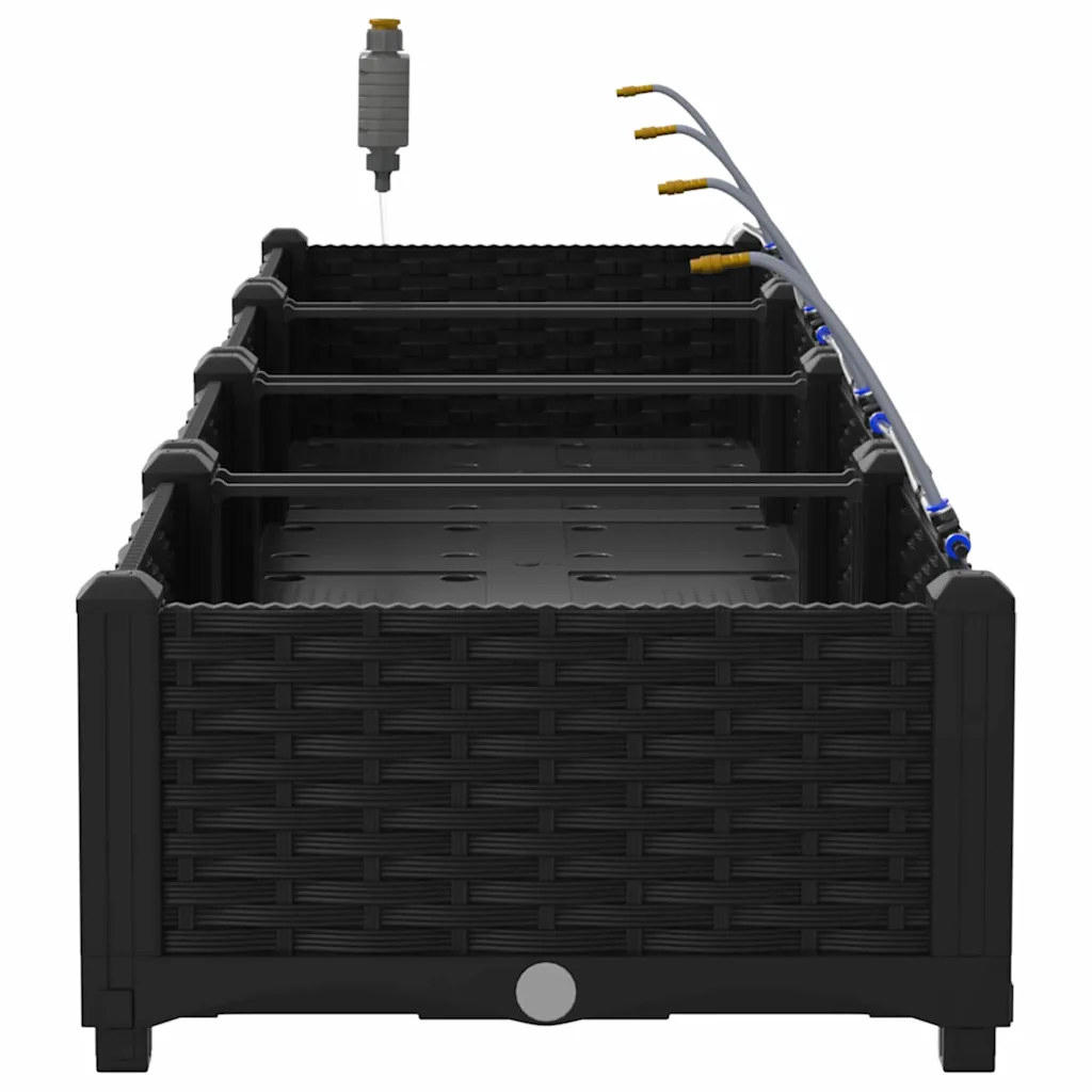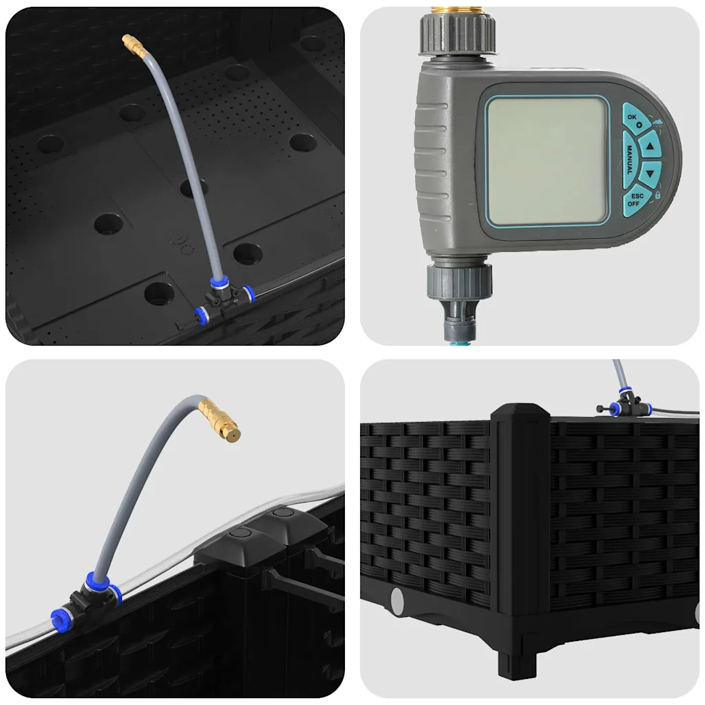 Nelja musta terasest istutuskasti komplekt koos integreeritud kastmissüsteemiga loob korrastatud ja efektiivse istutusala aeda või terrassile. Tugev konstruktsioon ja selge vorm aitavad taimed koondada ühte kohta ning lihtsustavad nende igapäevast hooldust.