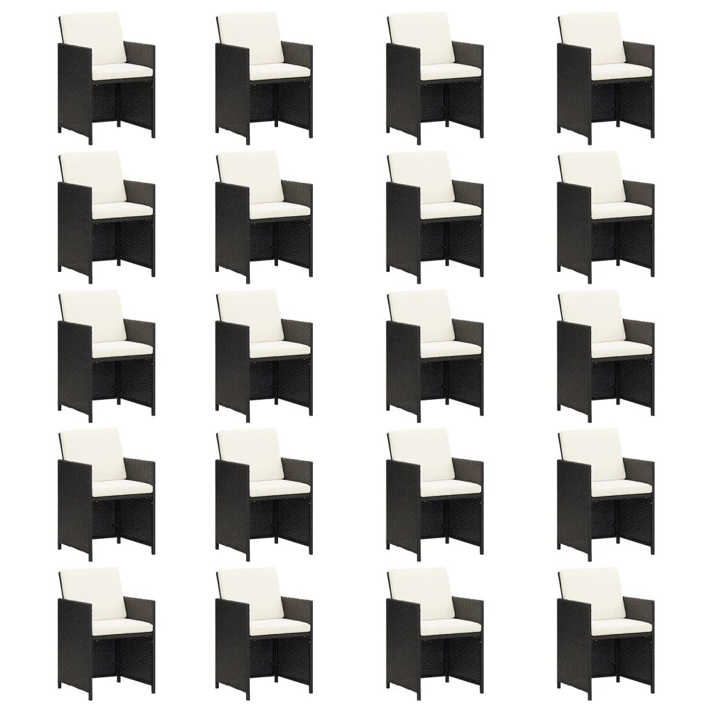 - 20 x tooli mõõtmetega 52 x 56 x 85 cm, mustast PE-rotangist ja pulbervärvitud terasraamiga