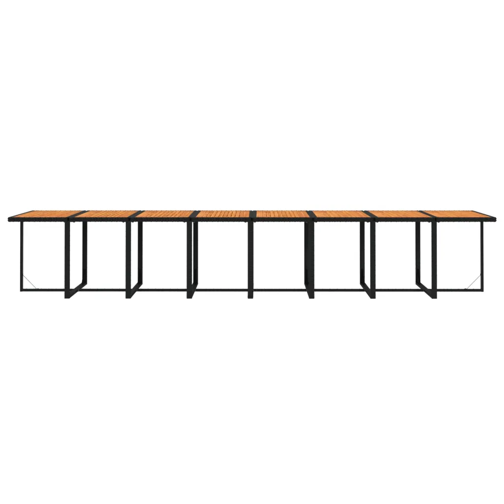 - 1 x laud mõõtmetega 443 x 107 x 74 cm, mustast PE-rotangist, pulbervärvitud terasraami ja akaatsiapuidust lauaplaadiga