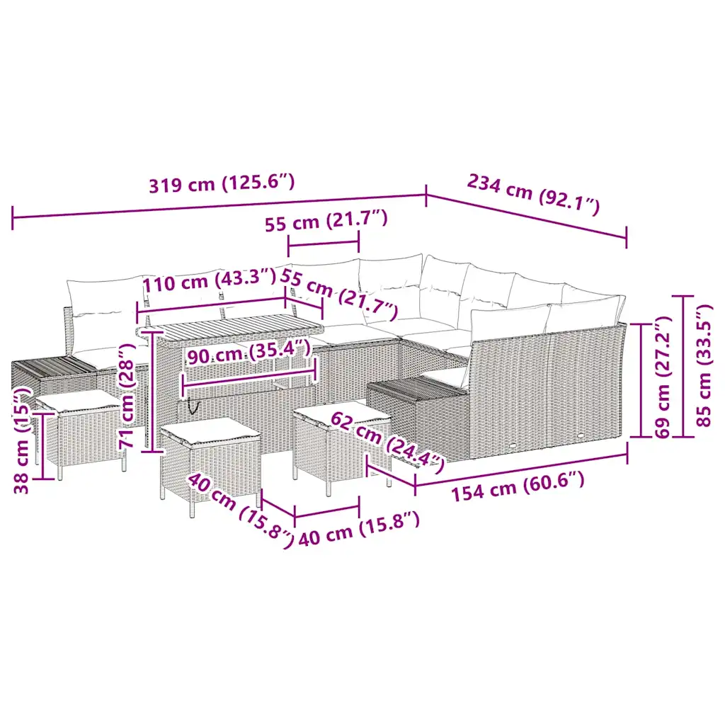 See 13-osaline must polürotangist aiamööbli komplekt on loodud terrassile, aeda või rõdule, kus on vaja palju istekohti ja nutikat panipaika. Mooduldiivan, reguleeritava kõrgusega laud ja istmete alla peidetud hoiuruum võimaldavad kujundada paindliku välisistumisala, mis sobib nii igapäevaseks lõõgastumiseks kui ka külaliste võõrustamiseks kevadest sügiseni.