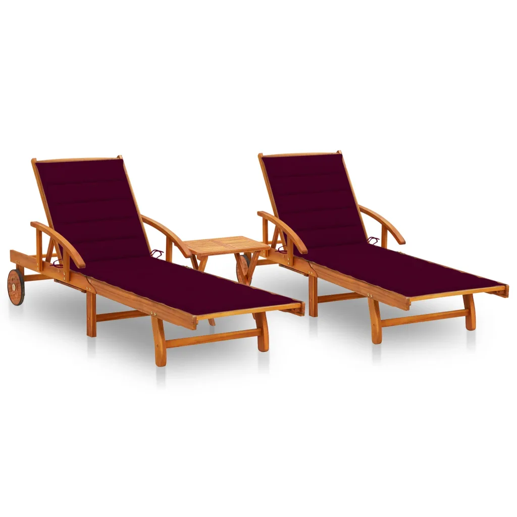 See 2-osaline akaatsiapuidust lamamistoolide komplekt lauaga loob aeda, terrassile või basseini äärde mugava koha lõõgastumiseks. Toekast õliviimistlusega akaatsiapuidust raam tagab vastupidavuse ning ilmastikukindluse, samal ajal kui veinipunased istmepadjad lisavad värvi ja pehmust. Reguleeritav selja- ja jalatugi ning ratastega konstruktsioon võimaldavad lamamistoolid kohandada just sinu puhkeasendi ja õueala järgi.