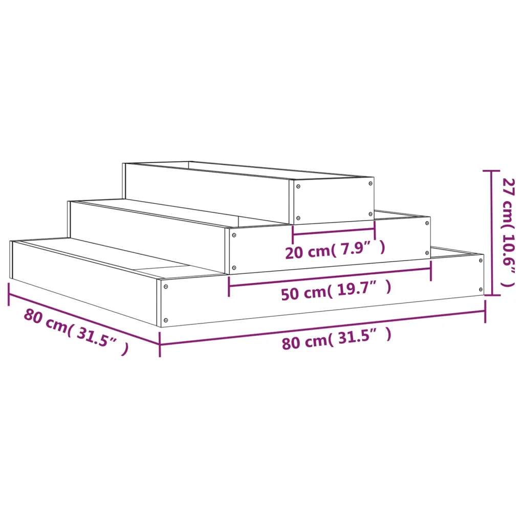 Komplektis on üks astmelise disainiga ebatsuugapuidust taimekasti detailikomplekt mõõtmetega 80 x 80 x 27 cm ning kokkupaneku juhend.