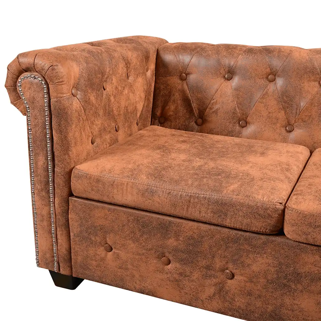 Kuue istekohaga Chesterfieldi nurgadiivan ühendab klassikalise inglise stiili ja praktilise mugavuse. Pruunist kunstnahast polsterdus, sügavad nööp-tihendused ja kaarjad käetoed annavad ruumile elegantse ilme, samal ajal kui pehme istumisosa ja tugev puitraam tagavad igapäevases kasutuses stabiilsuse ja meeldiva istumismugavuse.