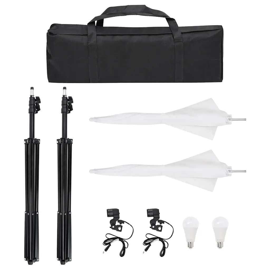 See fotostuudiokomplekt pakub kõik vajalikku, et saavutada ühtlane ja loomulik valgustus nii stuudios kui ka muus pildistuspaigas. Kahe 5500 K LED-valgusti ja pehmet valgust andvate valgete vihmavarjudega väldid karmi varju ning suur must taustakangas loob puhta, häirivate elementideta tausta.
