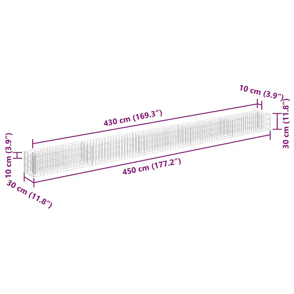 Tsingitud terasest gabioon-taimelava aitab luua aias või siseõues tugeva ja samas visuaalselt selge piirde lille- või taimepeenrale. Konstruktsioon on mõeldud täitmiseks kivide või kruusaga, mis annab sellele suure stabiilsuse ja kandevõime. Rooste- ja ilmastikukindel materjal sobib hästi välistingimustesse ning hõbedane viimistlus sulandub erinevatesse aialahendustesse. Pikk ja kitsas vorm mõõtmetega 450 x 30 x 30 cm võimaldab eraldada peenraid või teeradu ilma liigset pinda võtmata.