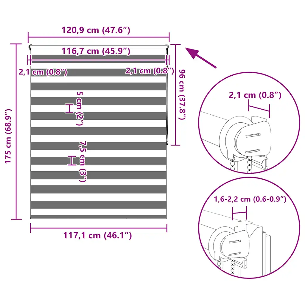 • Ülemise siini laius on 3 cm suurem kui kangas, mistõttu katab siin koos kinnitustega aknaava veidi laiemalt ja jätab korrektse viimistletud mulje.