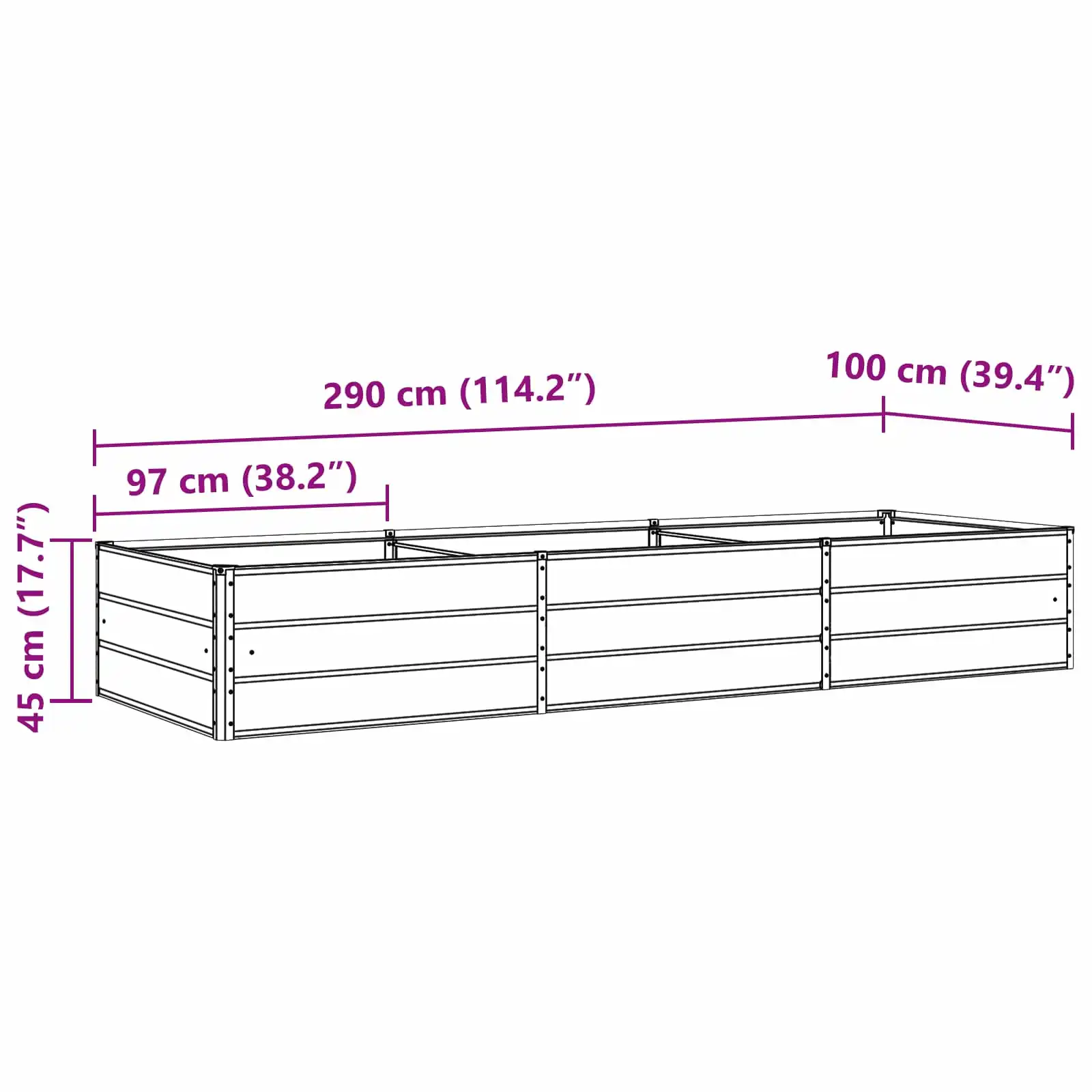 • Suured mõõtmed 290 x 100 x 45 cm pakuvad palju ruumi mitmesuguste lillede, maitsetaimede ja põõsaste istutamiseks.