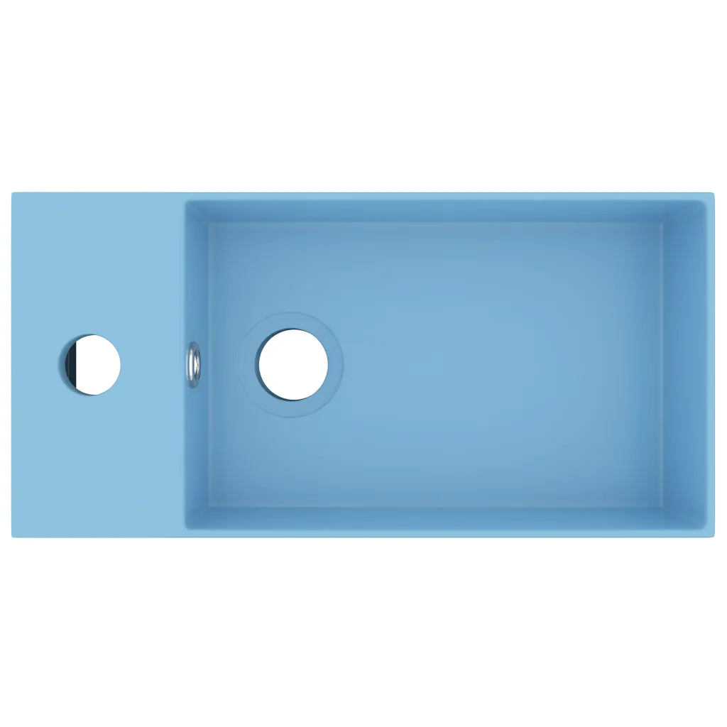 See helesinine keraamiline vannitoavalamu on mõeldud paigaldamiseks kapi või muu tasapinna peale ning sobib vannituppa, jumestusruumi, kööki või töökotta. Täiskeraamikast matt pind on lihtne puhastada ja vastupidav igapäevasele kasutusele, samas kui ülevooluava aitab vältida vee üleajamist.