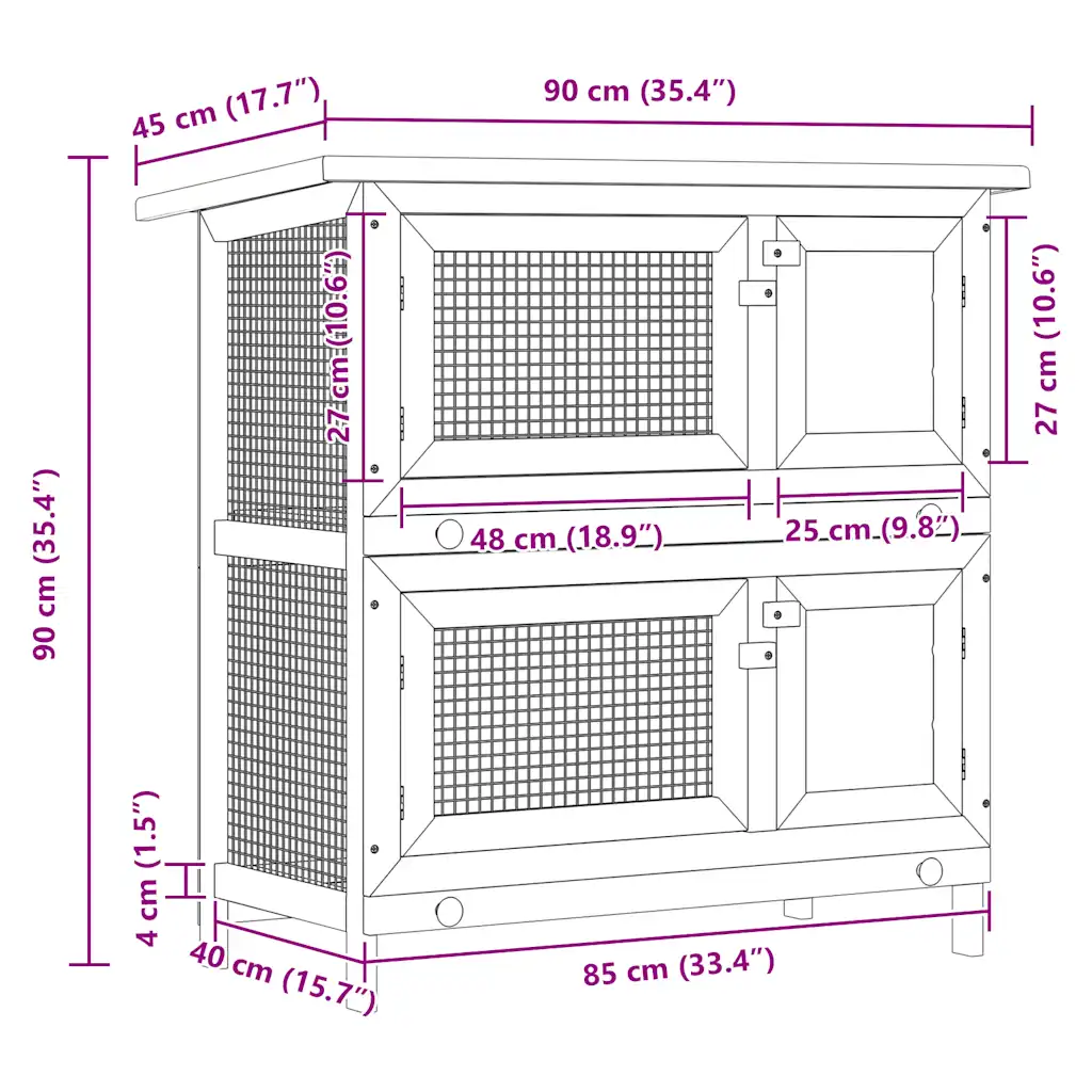 See kahekorruseline küülikupuur loob küülikutele ja teistele väikestele lemmikloomadele eraldi mängu- ja puhkealad, hoides nad õues turvaliselt piiratud alal. Ruumikas paigutus ja hästi läbimõeldud ligipääs muudavad igapäevase hoolduse lihtsaks nii loomale kui omanikule. Ilmastikukindel konstruktsioon sobib kasutamiseks aias või terrassil, soovitatavalt varjulises kohas.