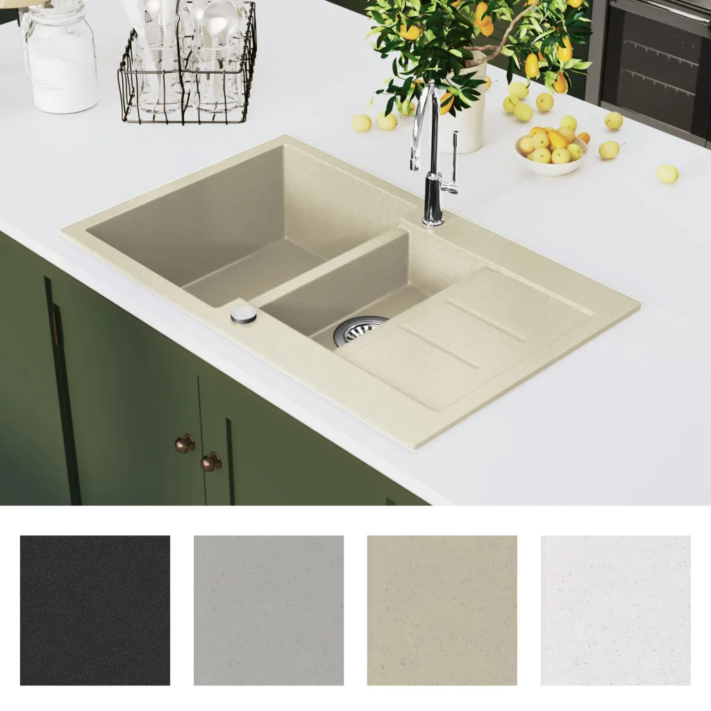 See beež kahepoolne graniitköögivalamu ühendab praktilise paigutuse ja ajatu välimuse, pakkudes köögis mugavat tööala nii pesemiseks kui loputamiseks. Kaks sügavat valamut ja kuivatusala aitavad tõhusalt hakkama saada nii igapäevase nõudepesuga kui suuremate toidutegemistega.