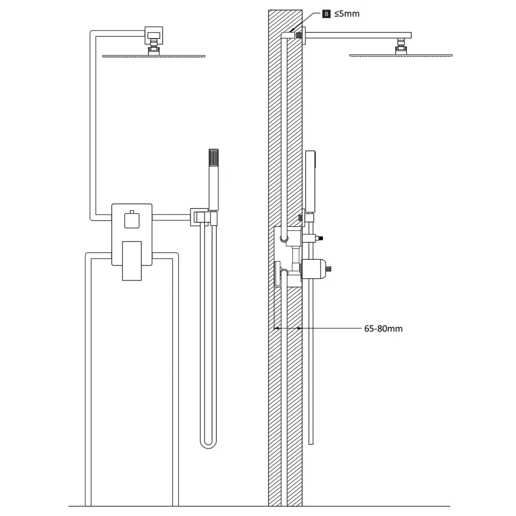 Dušisüsteem on mõeldud seinale paigaldamiseks ning selle kokkupanek on vajalik. Kasutage ühendamiseks G 1/2” standardkeermet ja komplektis olevaid paigaldustarvikuid. Kui segisti ümbrus kaetakse paigaldamisel tsemendiga, katke klapp ajutiselt kile või muu kaitsematerjaliga, et tsement ei kinnitaks klapi tuuma rõhukorki paika. Pärast tsemendi esmast kõvastumist eemaldage kaitse ning viimistlege sein vastavalt vajadusele.