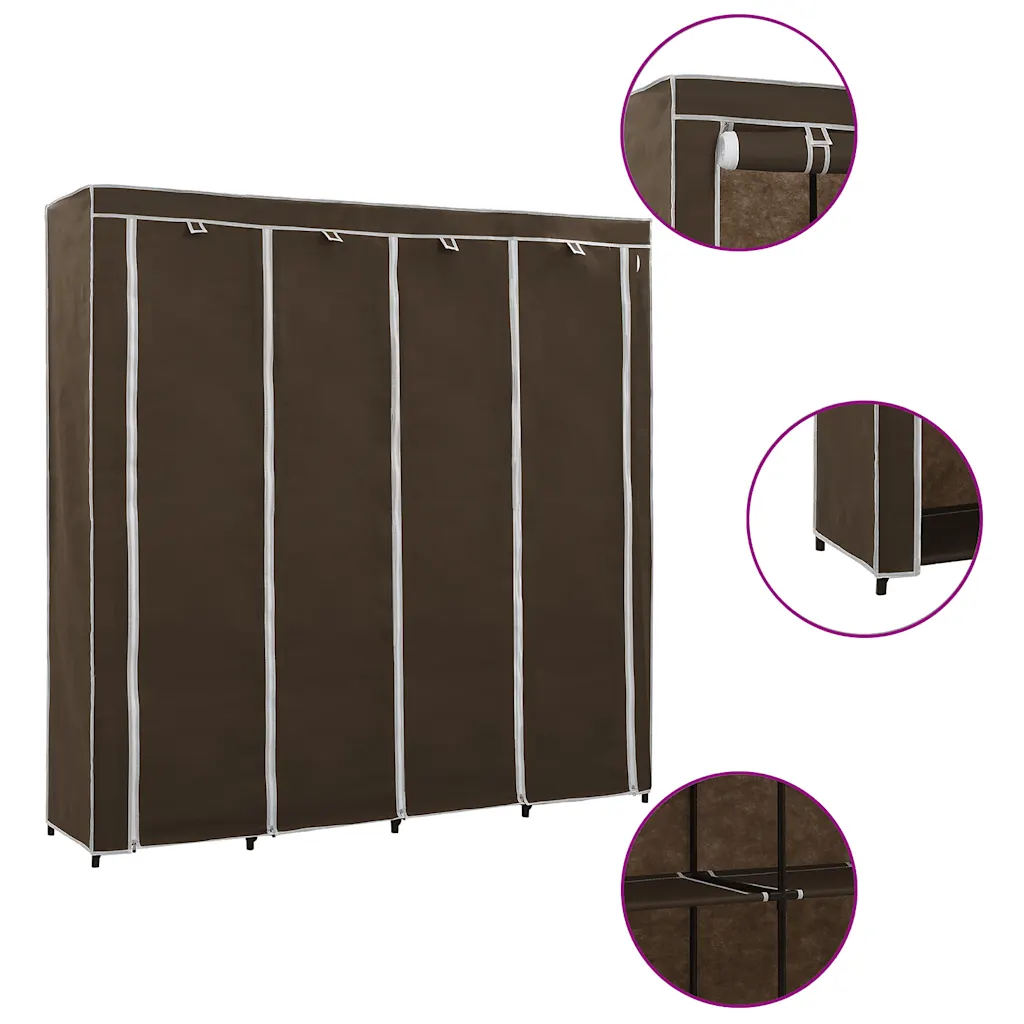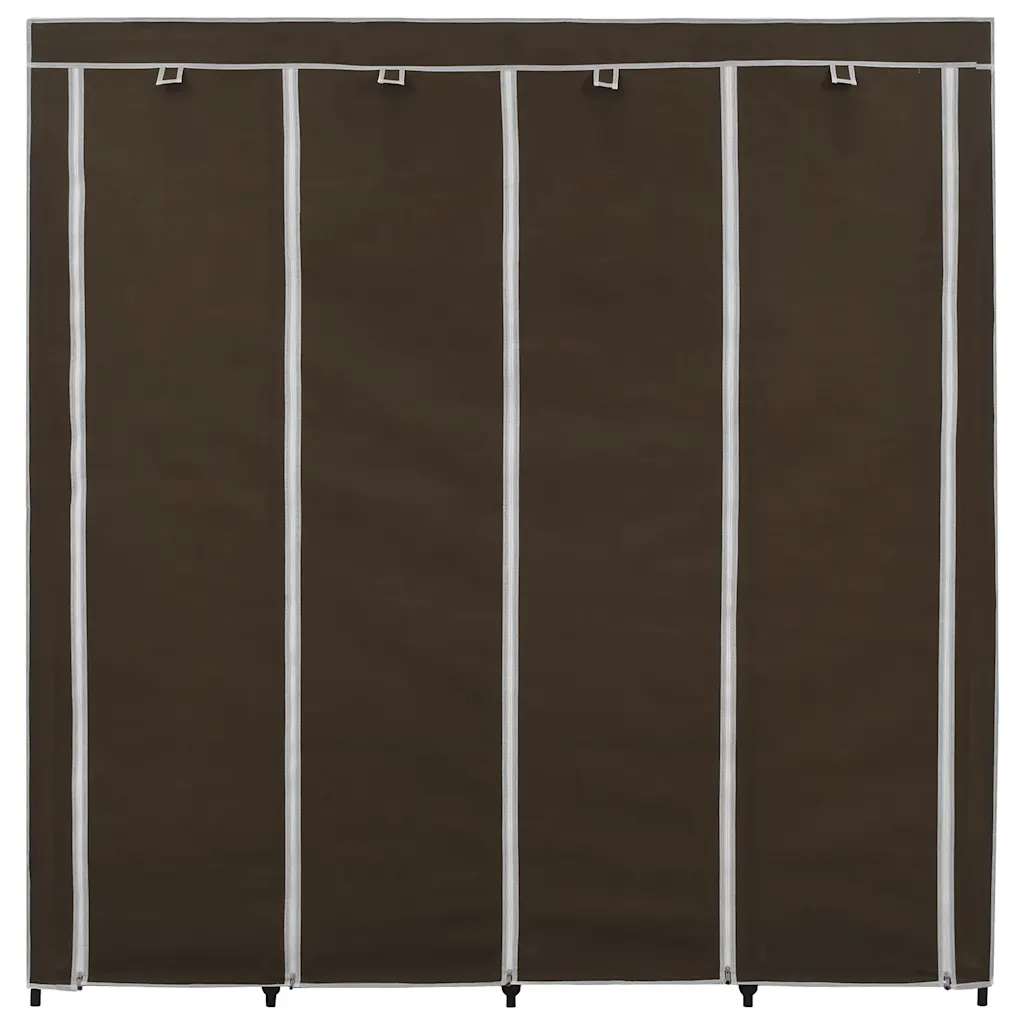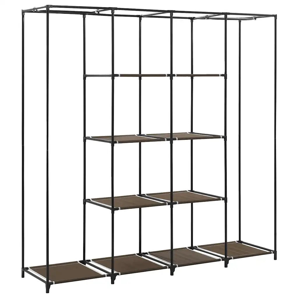 See pruun kangaskattega garderoob on praktiline lahendus riiete, jalanõude ja kottide hoiustamiseks, kui ruumi on vähe või kappe napib. Neli sektsiooni aitavad esemeid liigitada ja korras hoida, samas kui lukkudega kangaskate kaitseb neid mustuse ja tolmu eest.