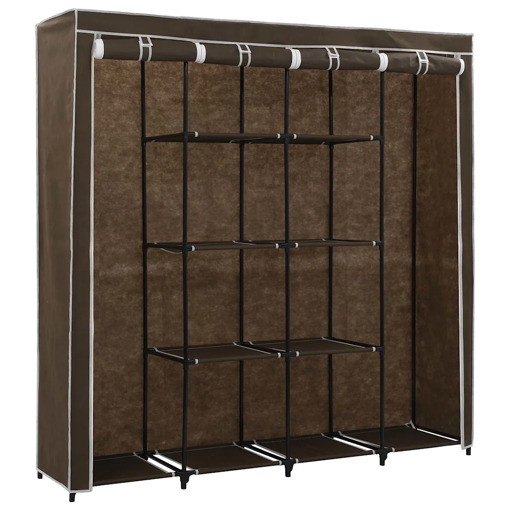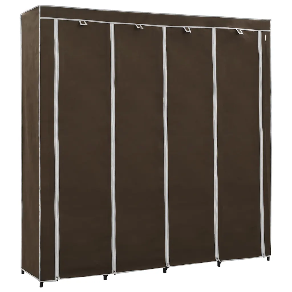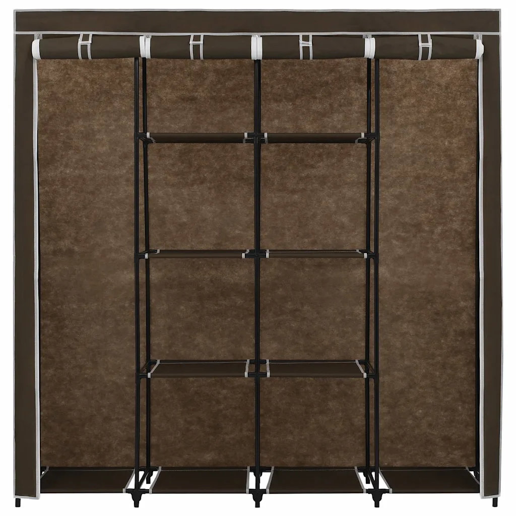 See pruun kangaskattega garderoob on praktiline lahendus riiete, jalanõude ja kottide hoiustamiseks, kui ruumi on vähe või kappe napib. Neli sektsiooni aitavad esemeid liigitada ja korras hoida, samas kui lukkudega kangaskate kaitseb neid mustuse ja tolmu eest.