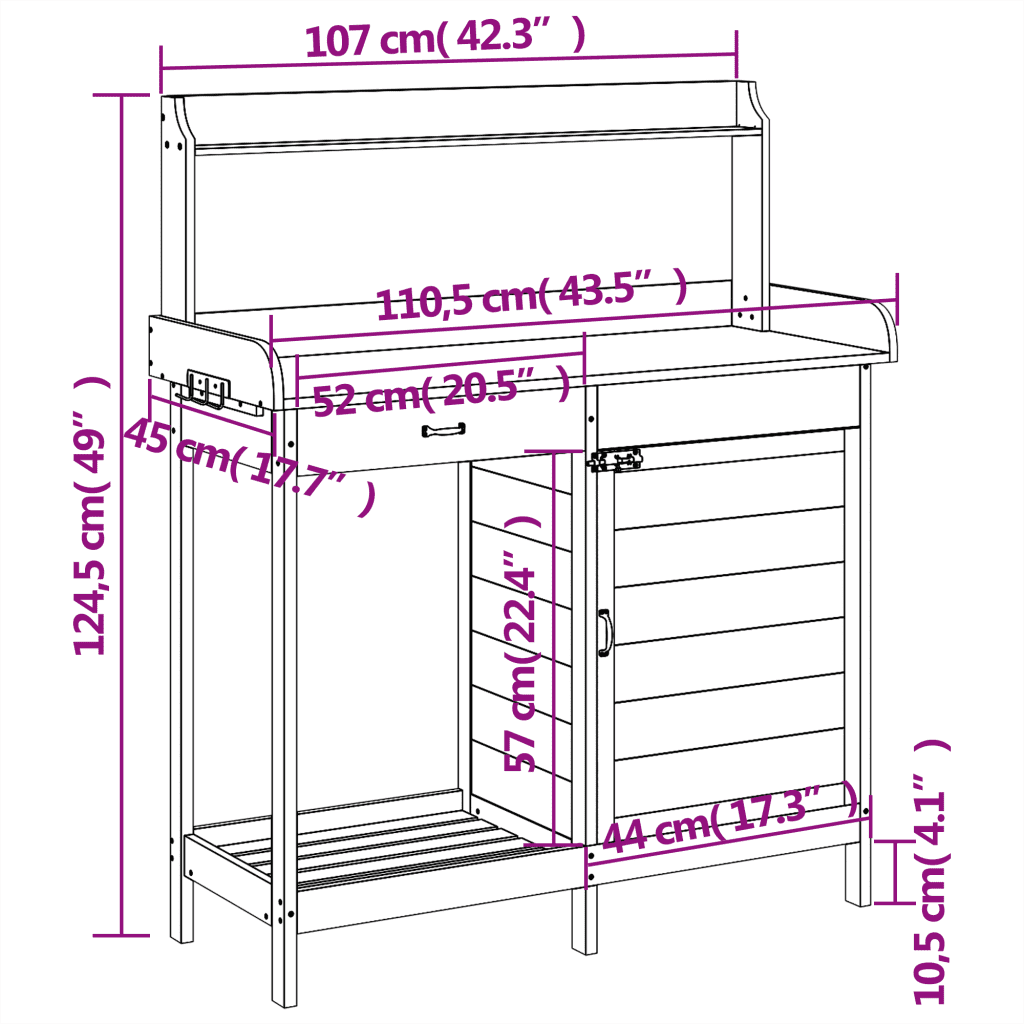 - Hea töö- ja hoiuala – tööpind suurusega 107 x 43 cm ning laua kogumõõdud 110,5 x 45 x 124,5 cm pakuvad piisavalt ruumi potitaimede, muldakottide ja tarvikute jaoks.