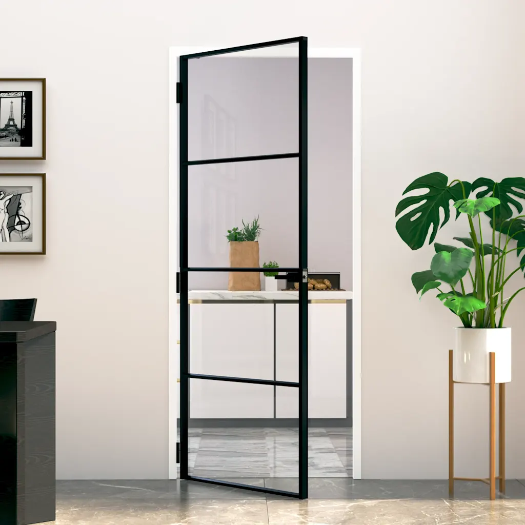 Vali see must ja läbipaistev siseuks, kui soovid ühendada ruumide visuaalset avatust ja praktilist eraldamist. Ukse tugev karastatud klaas ja stabiilne alumiiniumraam sobivad nii elutoa, köögi kui ka kodukontori vahele, pakkudes kaasaegset ilmet ja vastupidavat lahendust, mis laseb loomuliku valguse ruumides liikuma.