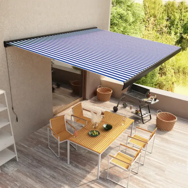 See sinise-valge terrassivarikatus ühendab ruumika varjualuse, vastupidavad materjalid ja lihtsa käsitsi kasutatava mehhanismi. Kui otsid võimalust muuta terrass või rõdu päikesepaistelisel ajal mugavamaks ning samas säilitada võimalus ala kiirelt avada, on see varikatus praktiline ja selge lahendus.