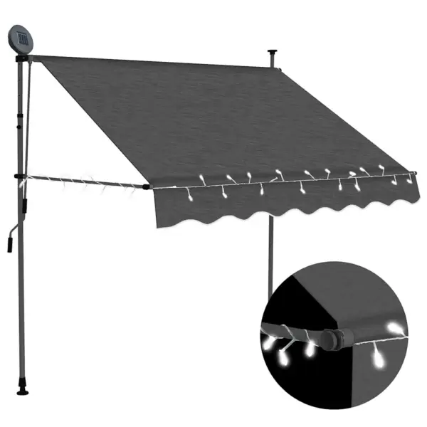 See varikatus ühendab tõhusa varjutuse ja praktilise LED-valgustuse, luues mugava ala akende, terrassi või rõdu kaitsmiseks. Vastupidav polüesterkangas ja terasraam tagavad pika kasutusea ning käsitsi juhitav mehhanism teeb kasutamise lihtsaks. Kui otsid kompaktset ja reguleeritavat lahendust väliala varjutamiseks, on see varikatus praktiline valik.