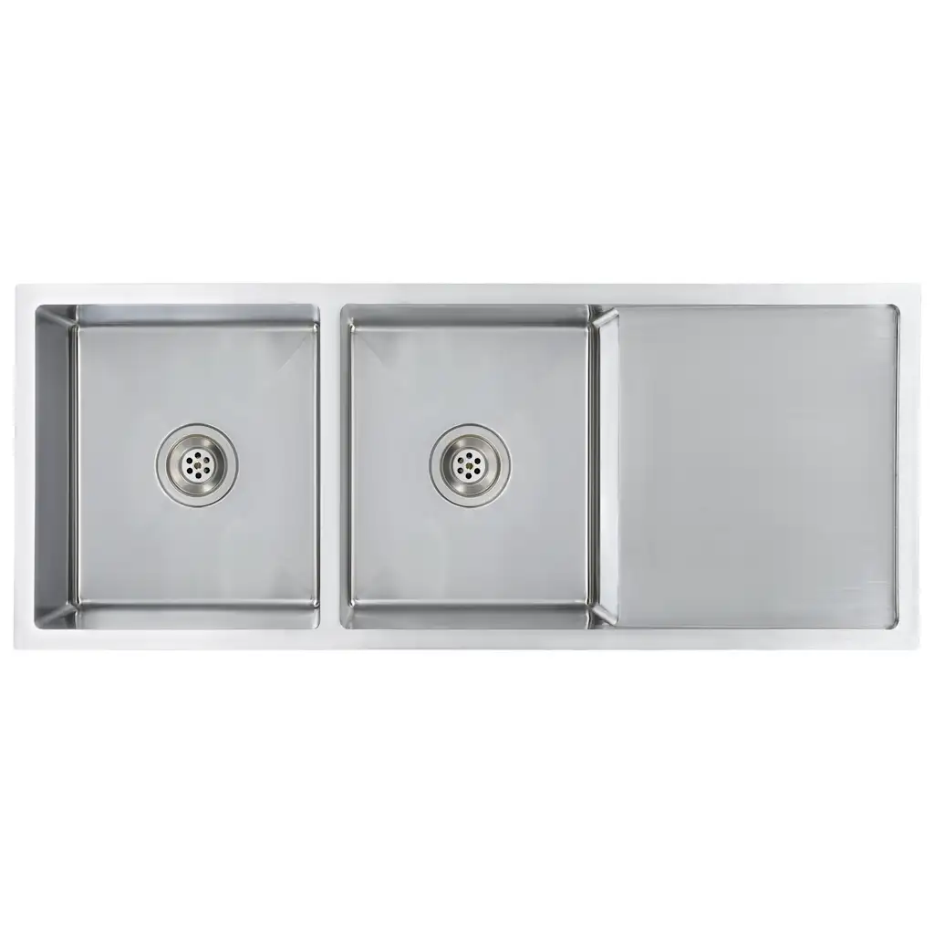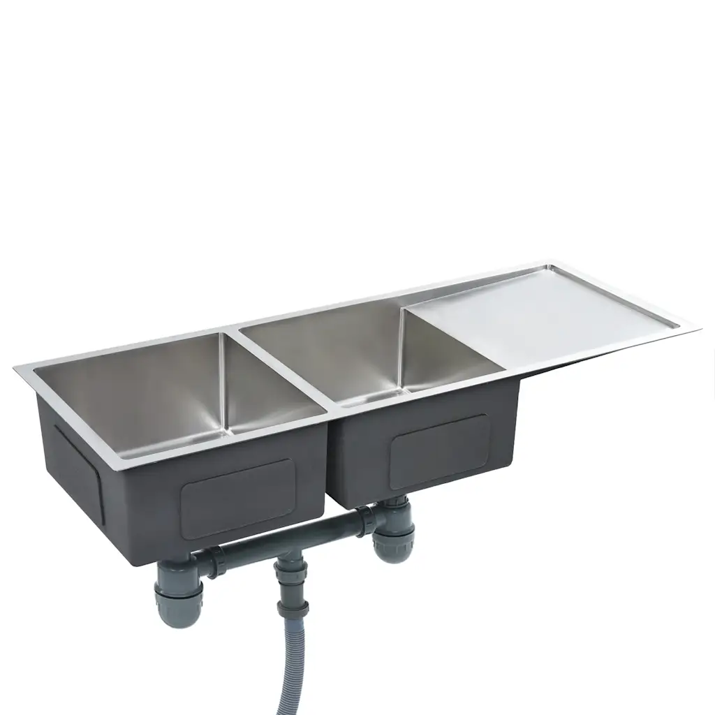See käsitsi valmistatud hõbedane köögivalamu harjatud roostevabast terasest ühendab modernse välimuse ja praktilise ruumikuse. Kahe eriti sügava kraanikausi ja külgmise nõrutusalusega on mugav korraga pesta nõusid, loputada köögivilju ja lasta neil kuivada. Kondensaadi- ja hallituskindel, pliivaba ning korrosioonikindel pind sobib igapäevasesse kasutusse ka intensiivsemalt koormatud köökides.