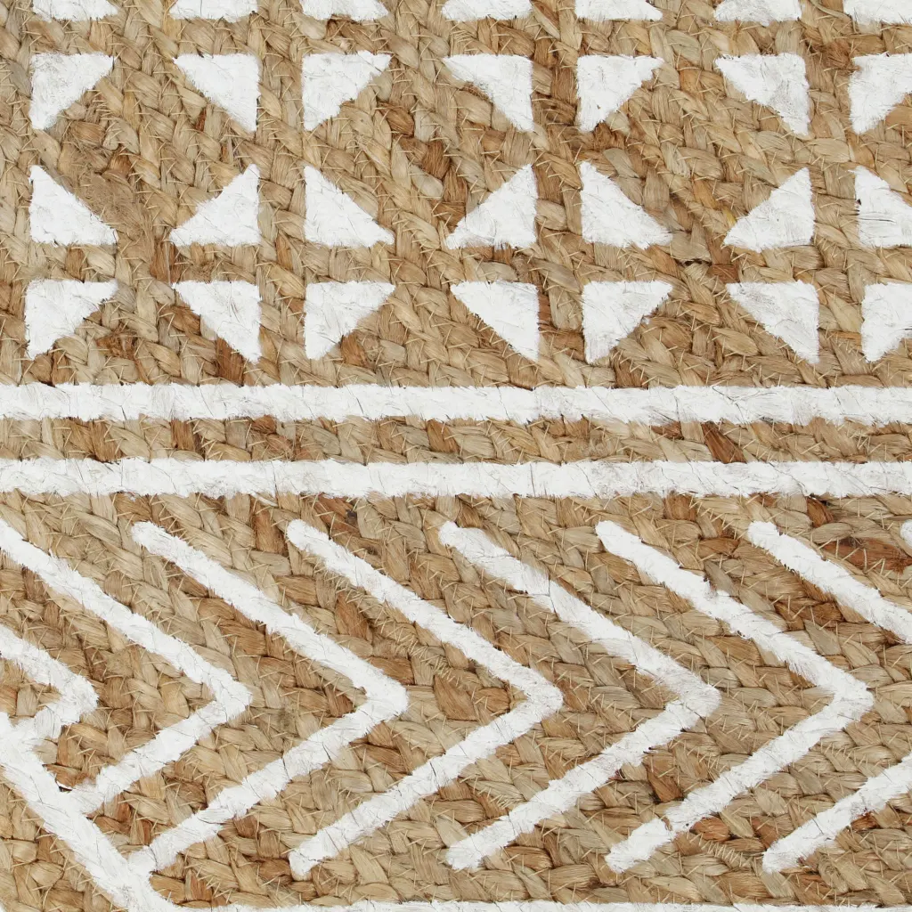 Ümmargune käsitsi valmistatud džuutvaip läbimõõduga 150 cm toob interjööri loodusliku tekstuuri ja modernse valge geomeetrilise mustri, mis sobib hästi nii elutuppa, magamistuppa kui esikusse.