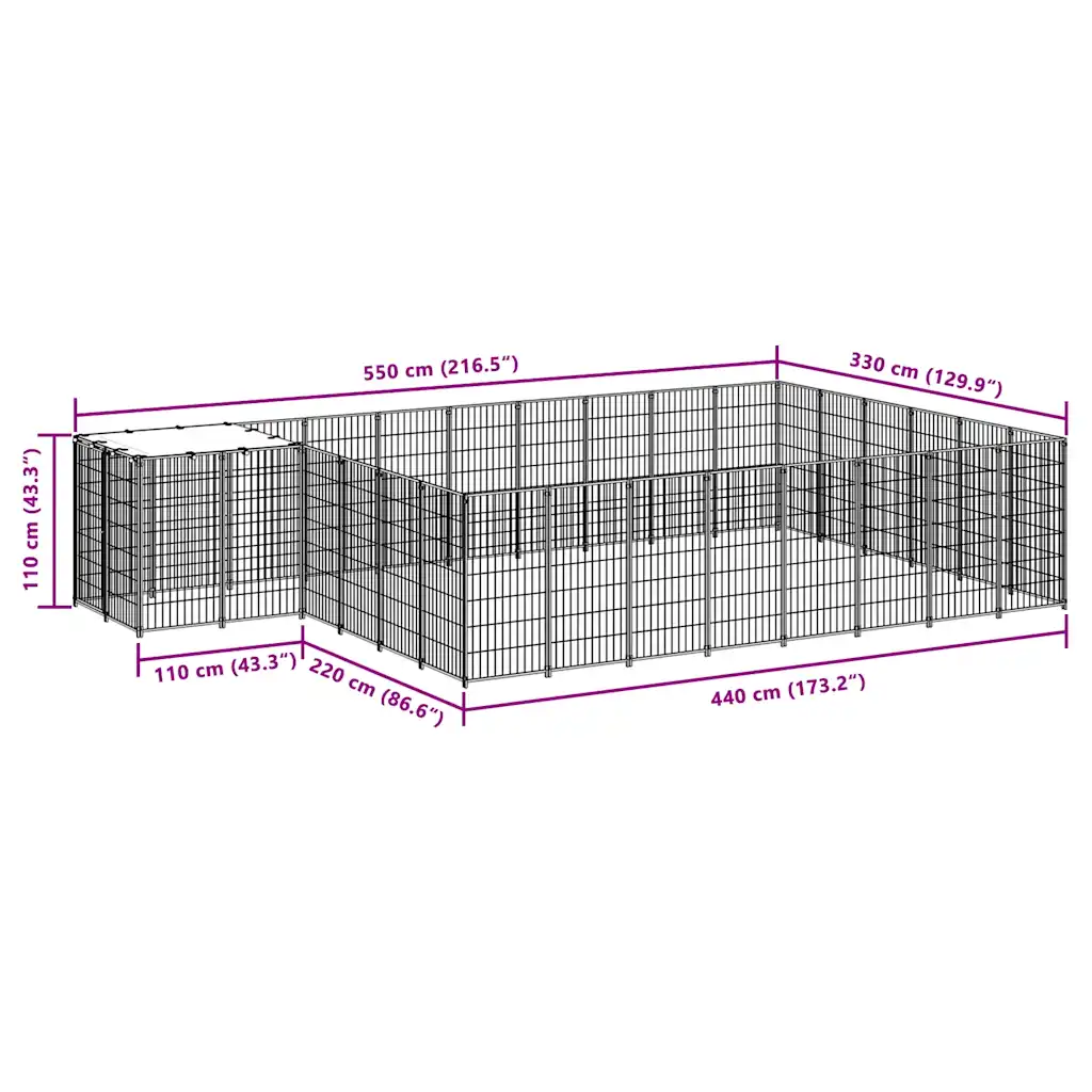 - Ruumikas mänguala – kogumõõtmed 550 x 330 x 110 cm pakuvad koertele 15,73 m² liikumisruumi, mis sobib igapäevaseks õues viibimiseks.