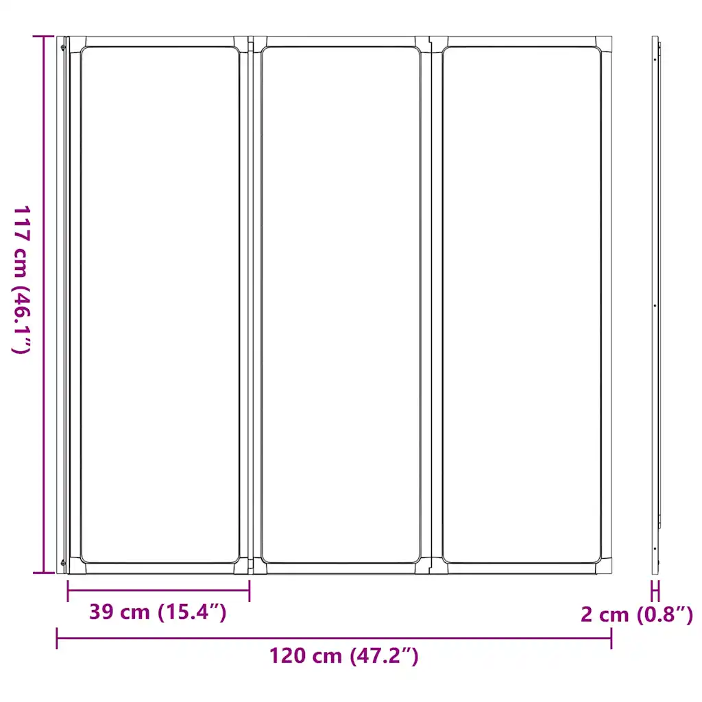 - 3-paneeliline kokkupandav vannisein mõõtudega 117 x 120 cm (kõrgus x laius).