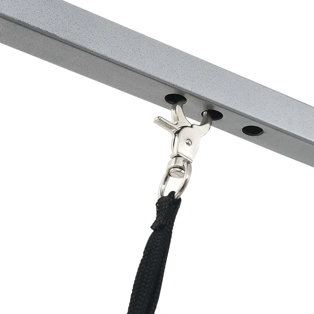 Aseta trimmimislaud tasasele pinnale ja ava kokkupandavad jalad, kuni raam on kindlalt lukustunud. Kinnita roostevabast terasest pide koos reguleeritava aasaga ning seadista aasa pikkus vastavalt koera suurusele, et loom püsiks hoolduse ajal stabiilselt paigal. Pärast kasutamist saad pideme ja aasa hõlpsalt eemaldada, lauaplaadi kokku voltida ning tänu ratastele laua mugavalt hoiukohta veeretada.