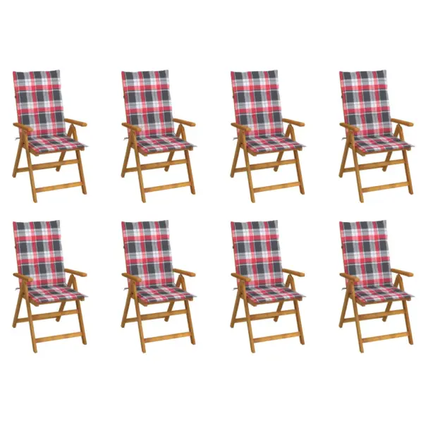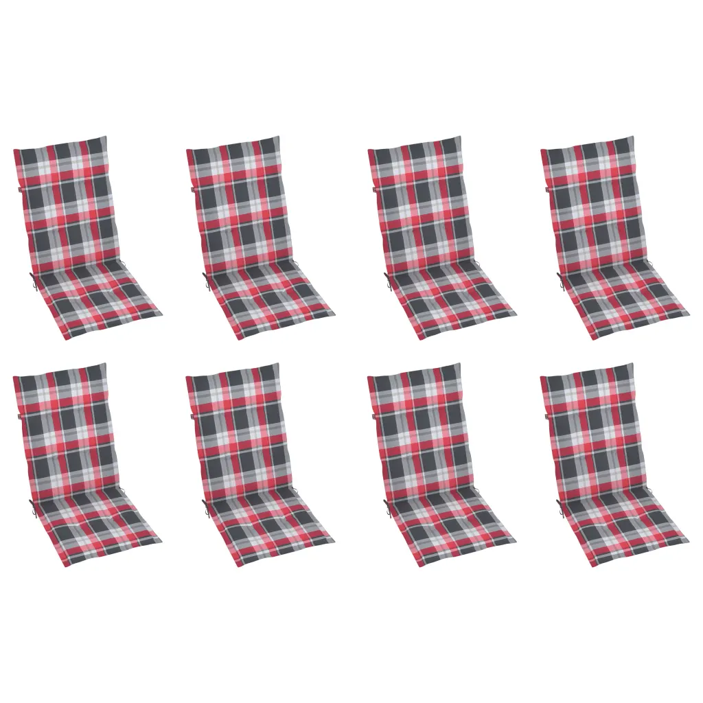 See 8-osaline õliviimistlusega akaatsiapuidust aiatoolide komplekt loob mugava istumisala teie aeda, terrassile või siseõuele. Toolidel on kõrge seljatugi, käetoed ja pehmed punaseruudulised padjad, mis teevad õues einestamise ja puhkehetked eriti nauditavaks. Tänu kokkupandavale konstruktsioonile on toolid lihtsasti hoiustatavad ja kaasavõetavad ning reguleeritav seljatugi võimaldab valida istumiseks sobiva asendi.