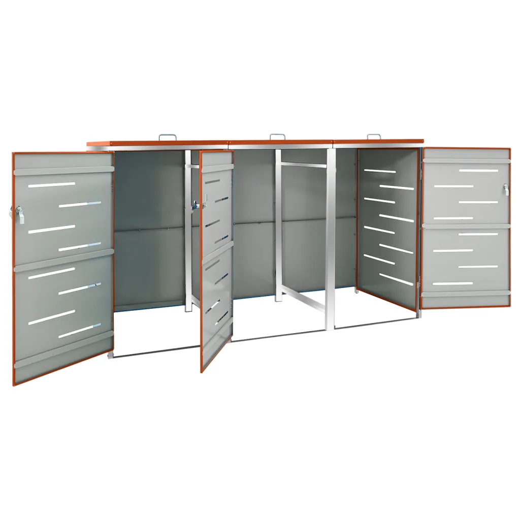 Kolmele prügikastile mõeldud kuur aitab peita prügikastid teiste pilkude eest ja hoida aia üldilme korrastatuna. Vastupidavad tsingitud teraspaneelid ja roostevabast terasest raam on roostekindlad, sobides hästi välitingimustesse ning lukustatav konstruktsioon hoiab prügi turvaliselt suletuna.