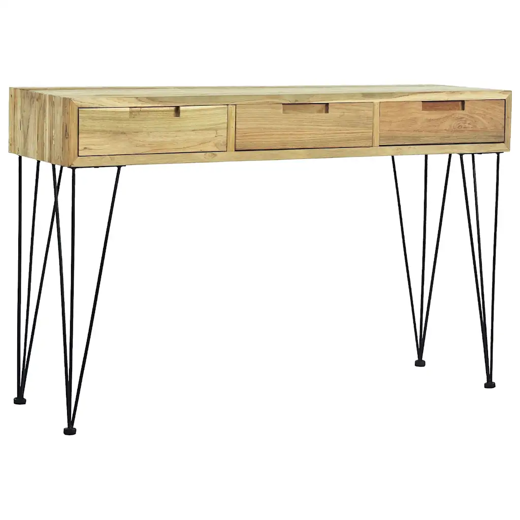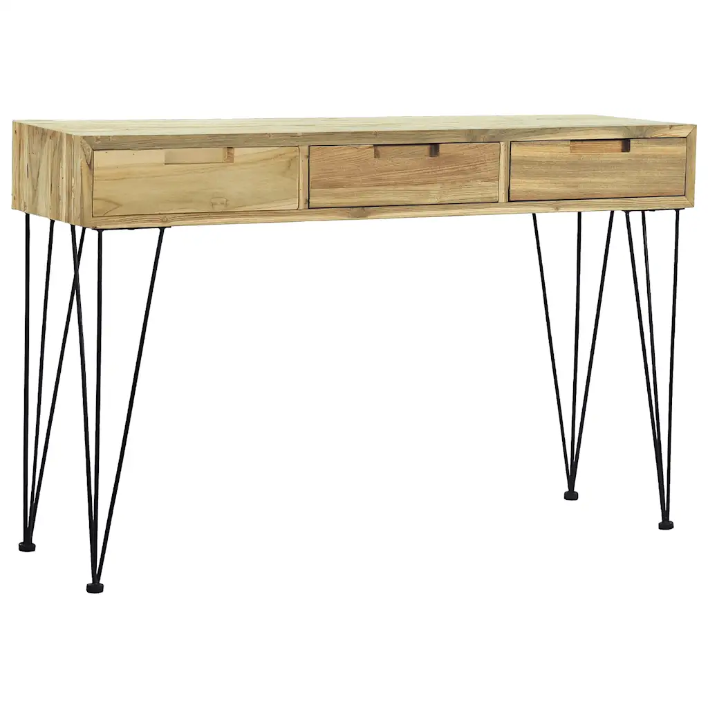 See taaskasutatud tiigipuidust konsoollaud toob esikusse, elutuppa või söögituppa sooja, maalähedase ilme ning pakub samal ajal praktilist hoiuruumi. Kolm avarat sahtlit aitavad hoida võtmeid, dokumente ja muid väiksemaid esemeid korrastatult käepärast, samal ajal kui tugev lauaplaat sobib hästi puuviljakorvi, vaasi või dekoratiivsete esemete eksponeerimiseks. Sepistatud rauast jalad annavad lauale stabiilsuse ja õhulise, kergelt koloniaalstiilist inspireeritud välimuse.