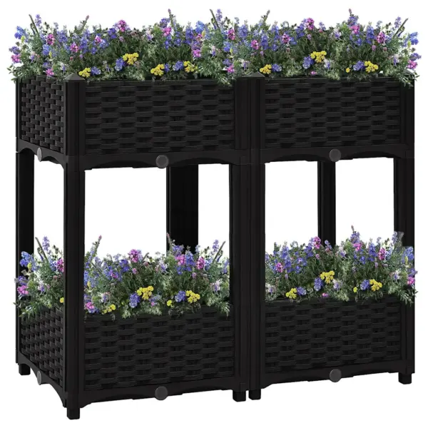 See kõrge taimekast 2 riiuliga on praktiline lahendus erinevate lillede, köögiviljade ja ürtide kasvatamiseks ning sobib hästi igapäevaseks kasutamiseks aias. Mustast polüpropüleenist valmistatud konstruktsioon on tugev ja vastupidav ning punutist jäljendav viimistlus loob taimedele stiilse tausta, mis täiendab teie aianurka.