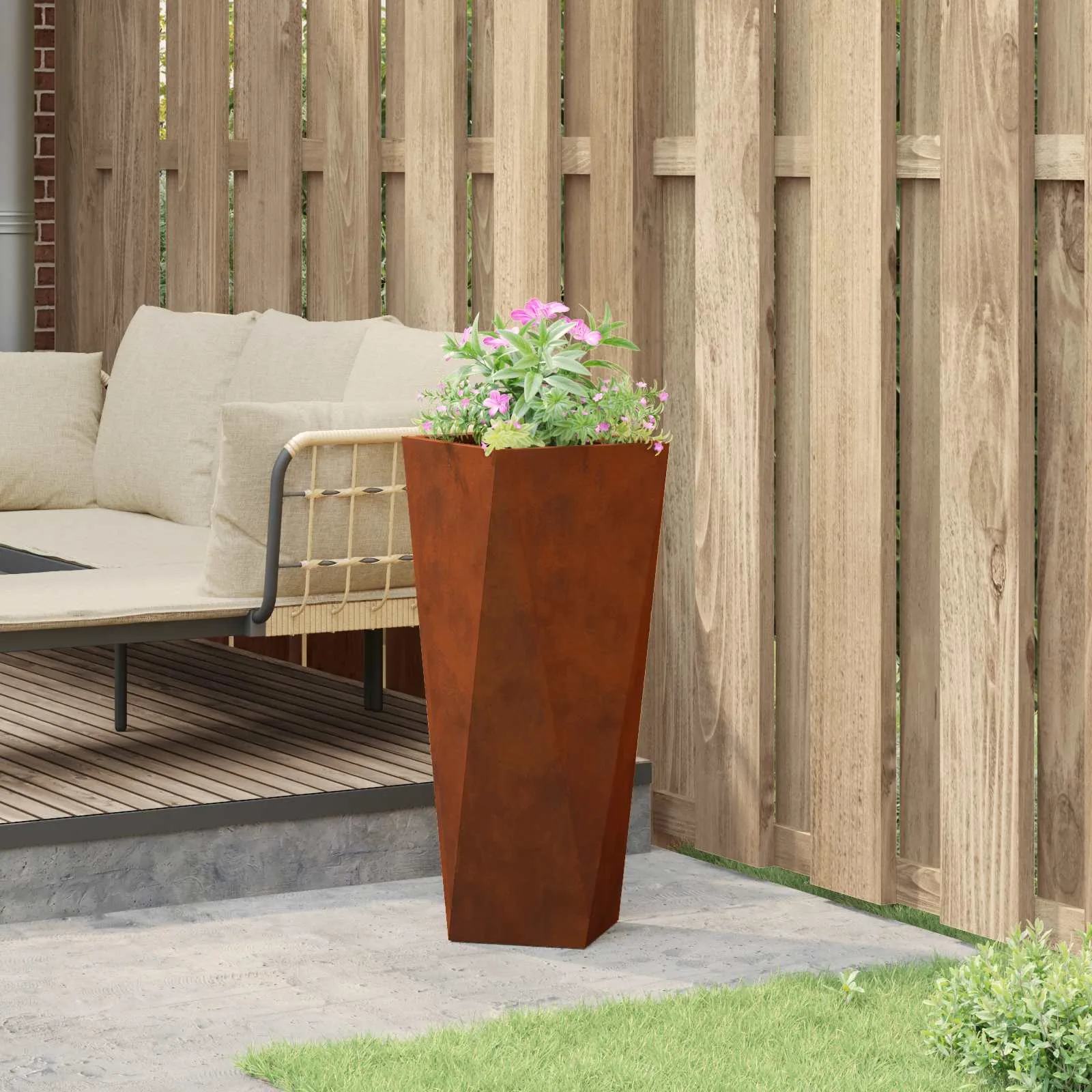 See kõrge terasest taimekast on praktiline lahendus, kui soovid terrassile, rõdule või aeda lisada vertikaalset rohelust ilma palju põrandapinda kulutamata. Roostevärvi viimistlus ja modernne, kergelt kitsenev kuju loovad pilkupüüdva aktsendi, mis sobitub nii kaasaegse kui ka looduslähedase väliruumi kujundusega. Tänu vastupidavale konstruktsioonile sobib istutuskast kasutamiseks aastaringselt välitingimustes.
