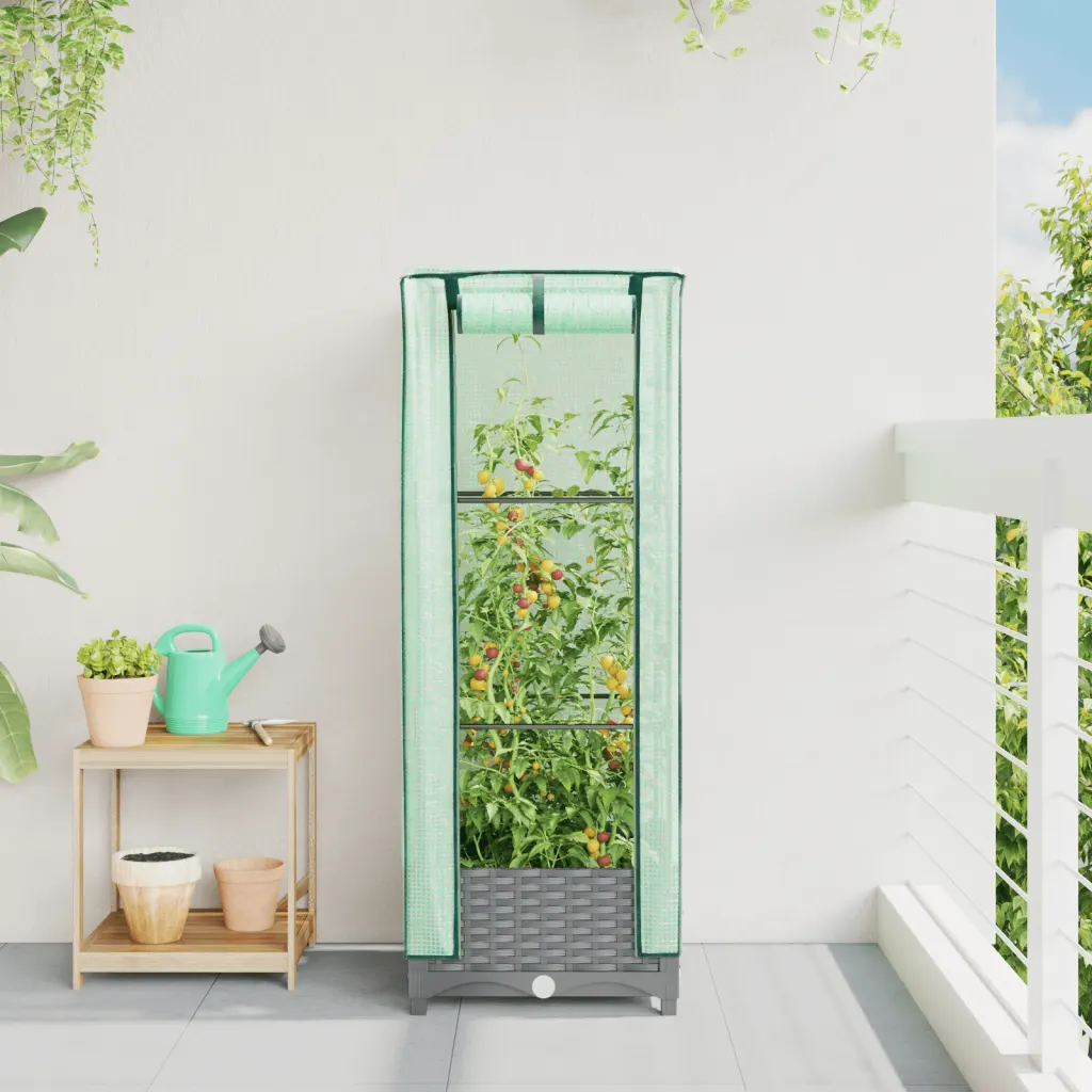 See kasvuhoonekattega kõrgendatud peenar ühendab ruumisäästliku vertikaalse lahenduse ja taimede usaldusväärse kaitse ühes kompaktses tootes. Vettpidav kate ja tugev toruraam loovad soodsa kasvukeskkonna, mis pikendab hooega ja vähendab kahjurikahjusid. Neutraalne helehall rotangiimitatsiooniga viimistlus sobib erinevatesse väliruumidesse, võimaldades mugavalt kasvatada maitsetaimi, köögivilju ja lilli ka väikesel rõdul või siseõuel.