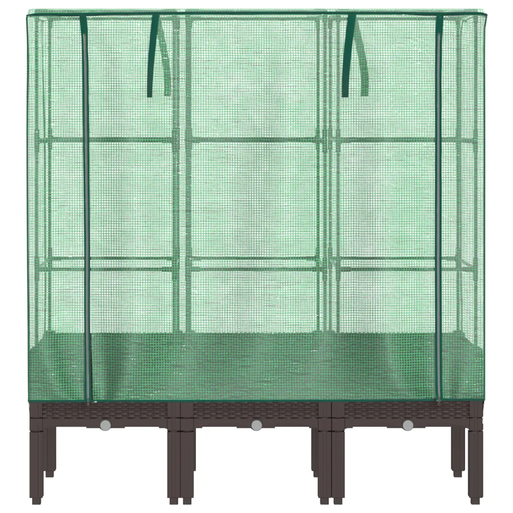 See kõrgendatud taimekast kasvuhoonekattega pakub sinu taimedele kaitstud ja stabiilse kasvukeskkonna rõdul, terrassil või aias. PP-st valmistatud peenar koos tugeva rauast toruraami ja PE võrguga aitab hoida taimi äärmuslike temperatuuride, vihma ning kahjurite eest, samal ajal kui rotangimustriga pruun viimistlus lisab väliruumile esteetilise ilme.