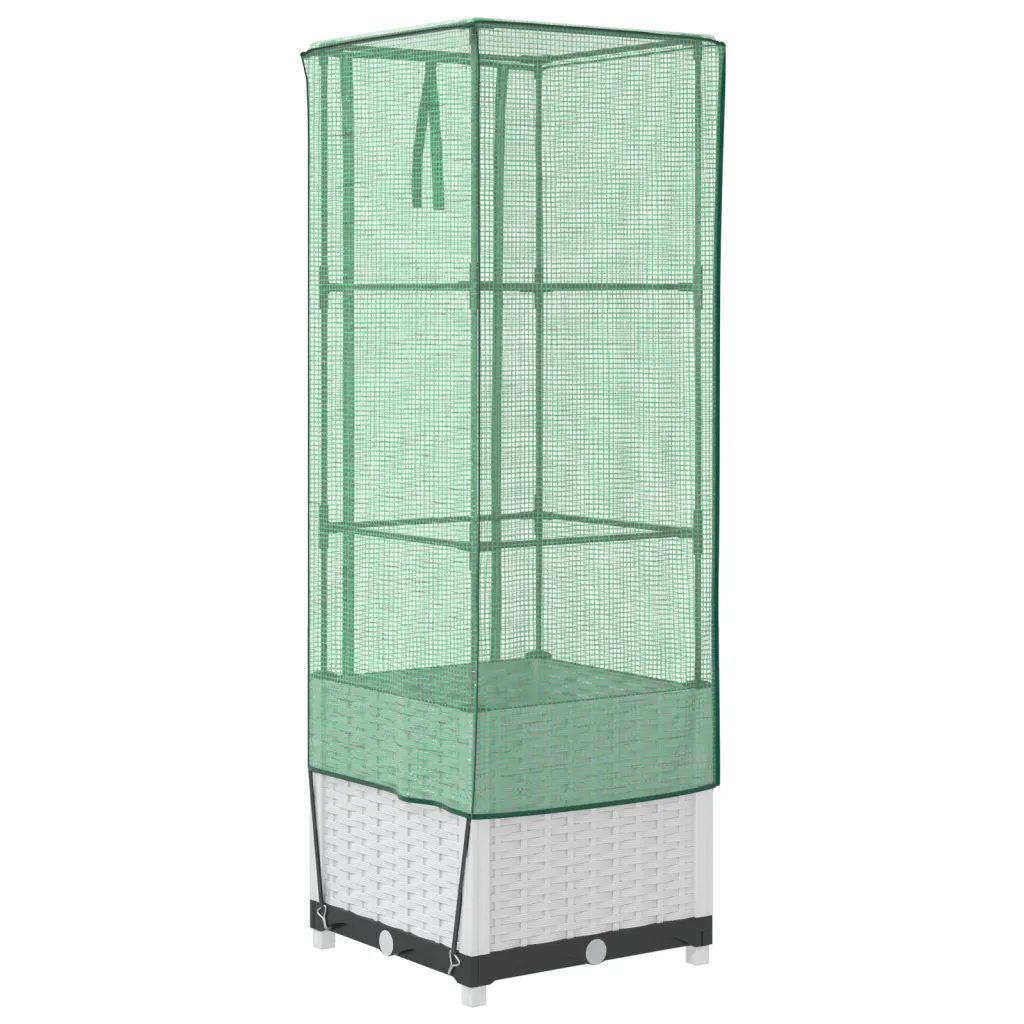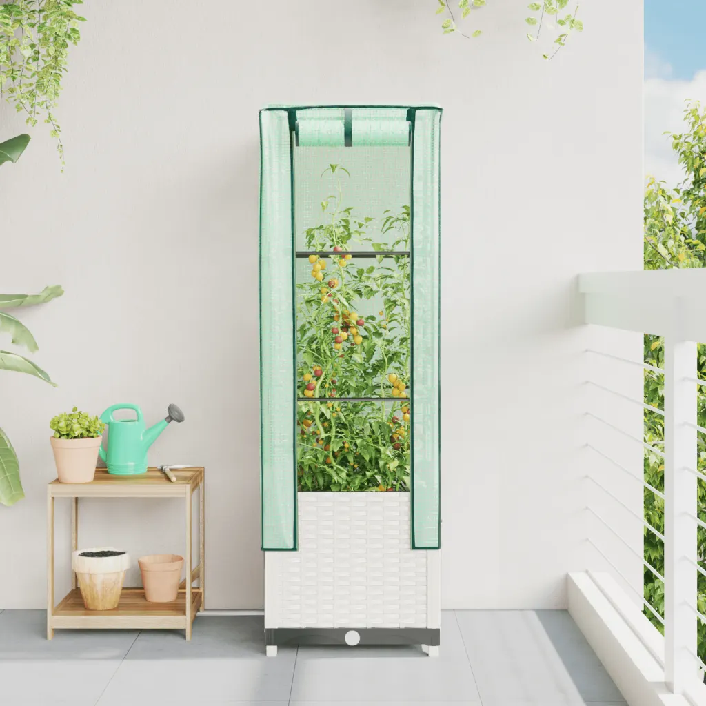 See kasvuhoonekattega kõrgendatud taimekast loob taimedele kaitstud kasvukeskkonna ka väiksemas aias, siseõues või rõdul. Tugev rauast toruraam ja vastupidav PP-taimekast tagavad stabiilse aluse, vettpidav PE-kate aitab hoida sobivamat temperatuuri ning kaitseb taimi putukate, lindude ja väikeloomade eest. Tänu rotangiimitatsiooniga valgele viimistlusele sobitub taimekast kenasti erinevate väliruumide sisekujundusega.