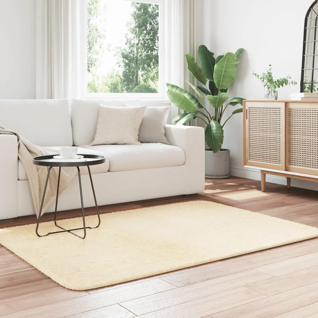 Kreemjasvalge Shaggy vaip NAVARRA lisab elutuppa, magamistuppa või kontorisse pehmust ja visuaalset soojust. Kõrge, 3,5 cm narmas loob jalge alla mugava ja hubase tunde, samal ajal kui vastupidav polüester ja libisemisvastane põhi muudavad vaiba igapäevases kasutuses praktiliseks.