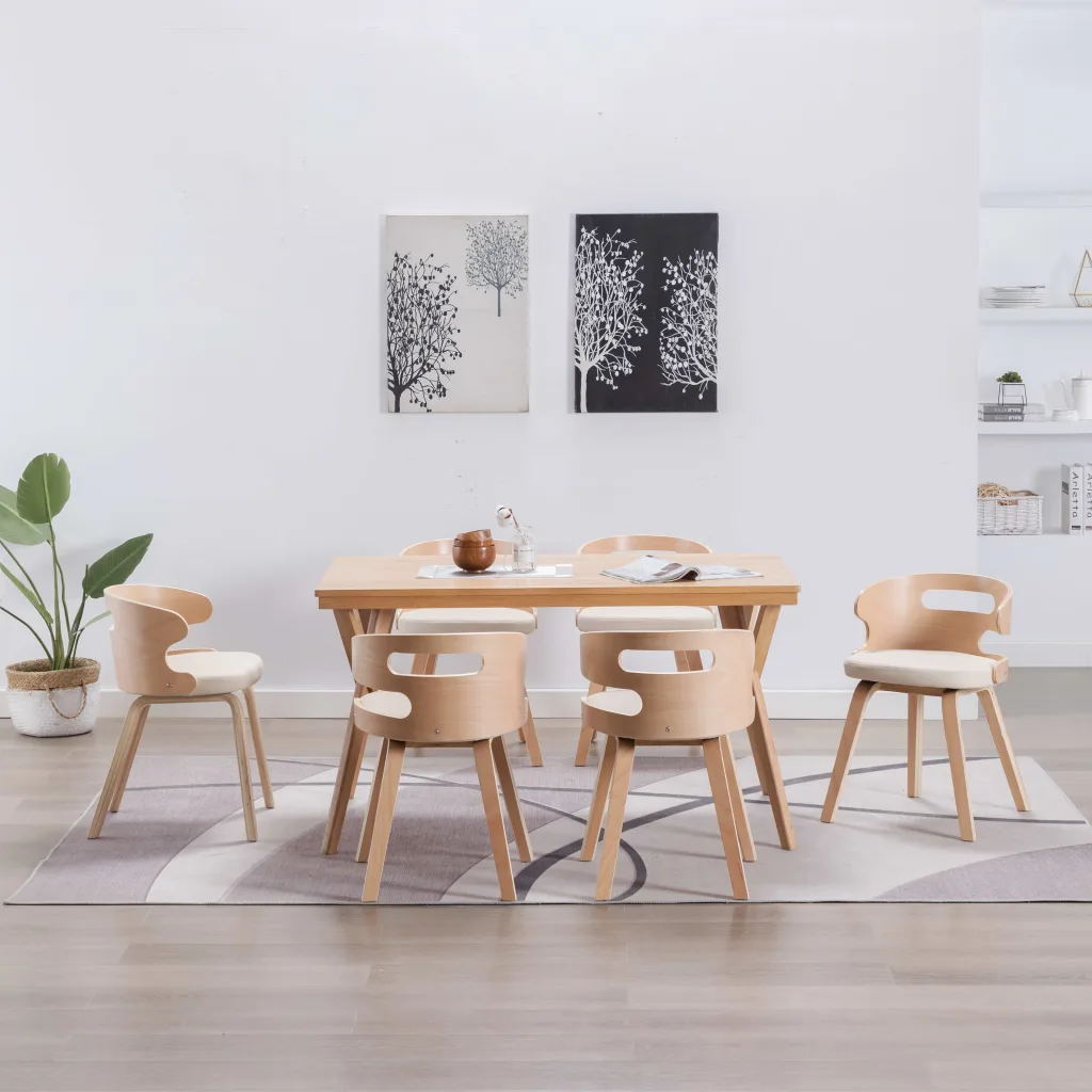 See kuuest söögitoolist koosnev komplekt ühendab ajatu disaini ja praktilise mugavuse, sobides nii kööki kui ka söögituppa. Kreemjasvalge kunstnahast iste ja pruunis toonis painutatud puitraam loovad sooja ja modernse ilme, mis sobitub hõlpsasti erinevate sisustusstiilidega.
