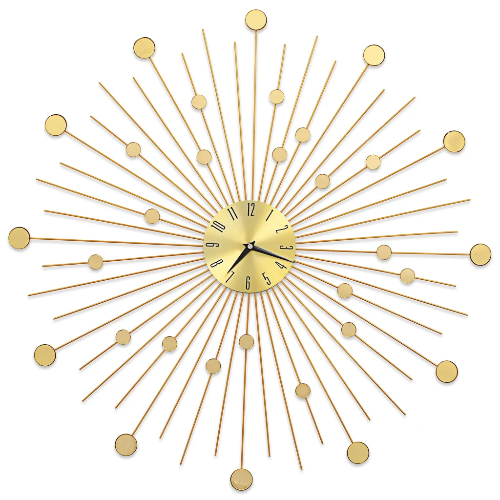 See kuldne metallist seinakell läbimõõduga 70 cm loob ruumi silmapaistva fookuspunkti. Päikesekiiri meenutav disain ja särav numbrilaud lisavad interjöörile dekoratiivse efekti, samal ajal kui kvartsmehhanism hoiab aega täpselt.
