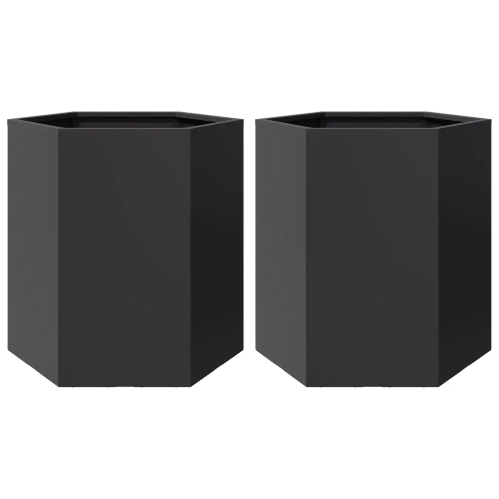 - 2 musta kuusnurkset aia taimekasti terasest, mõõtmetega 46 x 40 x 45 cm, ilma põhjata ja kokkupanekut vajavad
