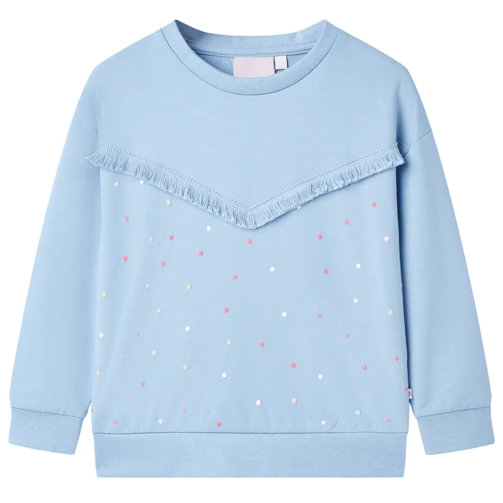 Komplektis on üks sinine laste dressipluus suuruses 104, millel on pikad varrukad, ümar kaelus, värvilised täpid ja dekoratiivsed narmad esiküljel.