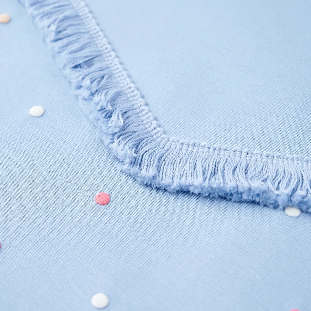 • Värvilised täpid ja narmad lisavad riidele erilise aktsendi ning muudavad dressipluusi lapsele visuaalselt põnevaks.