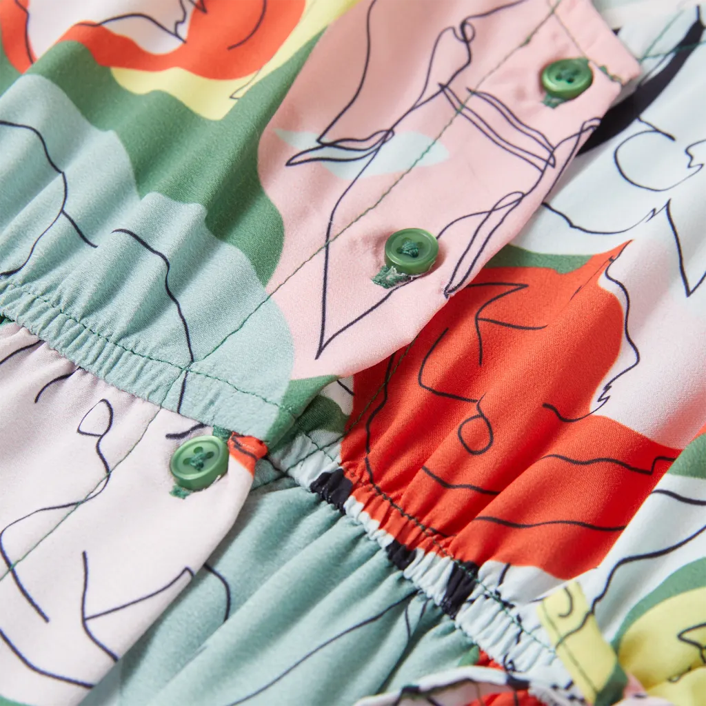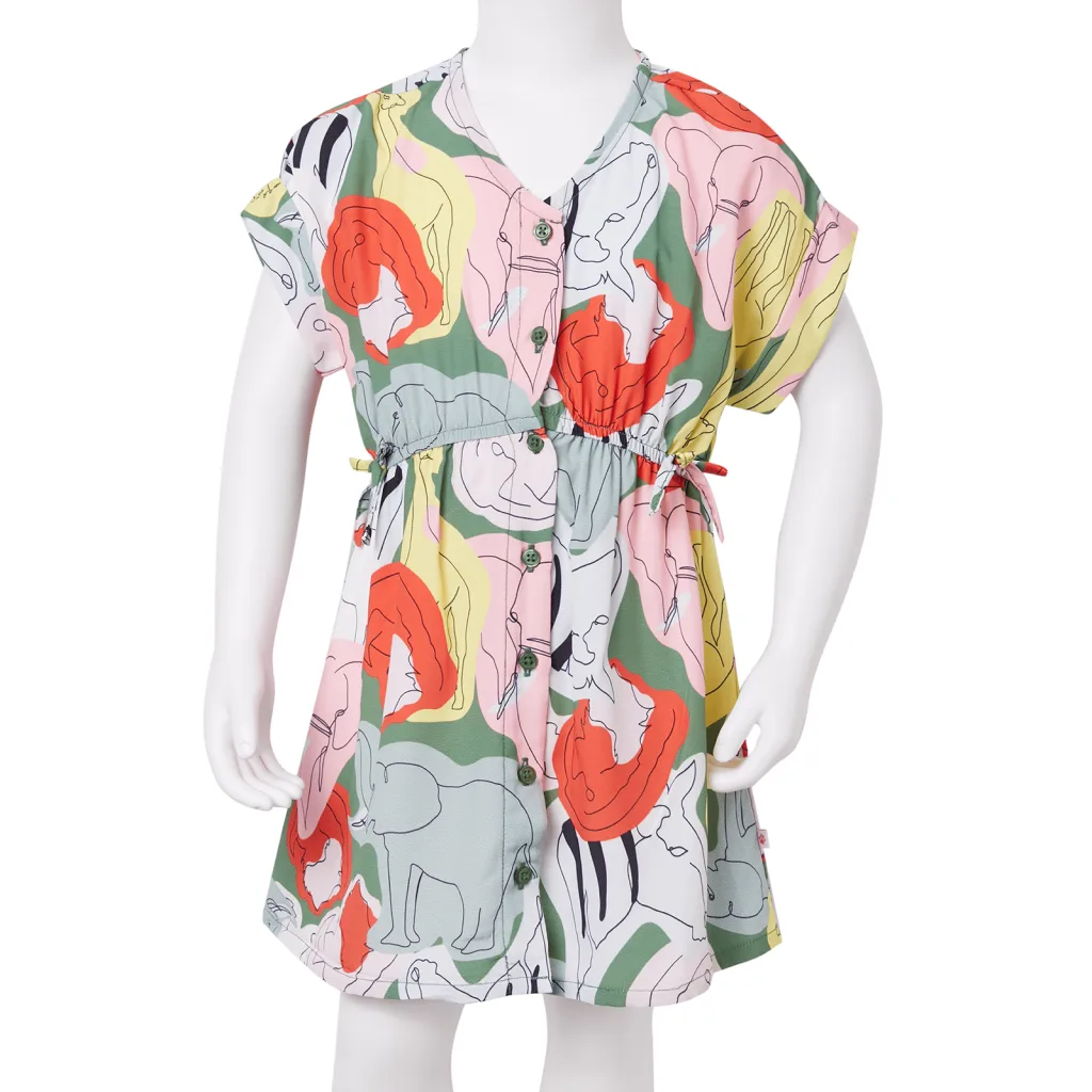 See roheline laste kleit on loodud igapäevaseks kandmiseks 9–10 aastastele lastele, pakkudes kerget ja vaba liikumist. Kleit on kõikjal loomatrükiga, mis annab rõivale mängulise ja värvika ilme. Ees asuvad nööbid ja vöökohal olev pingutusnöör võimaldavad kleiti mugavalt selga panna ning istuvust kohandada. Lühike laste kleit on valmistatud 100% polüestrist, mis on kerge ja hingav, sobides hästi nii koduseks kui ka koolipäevaks.