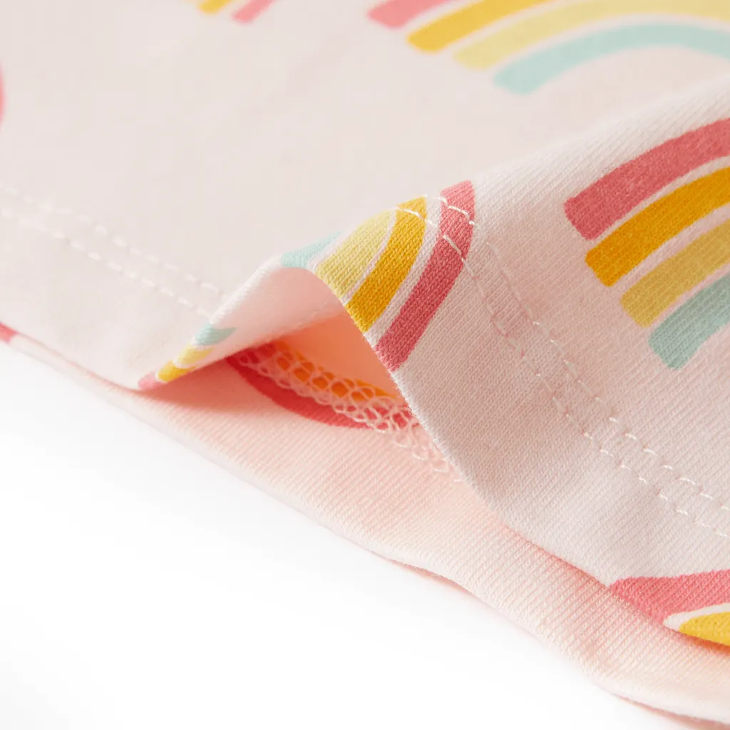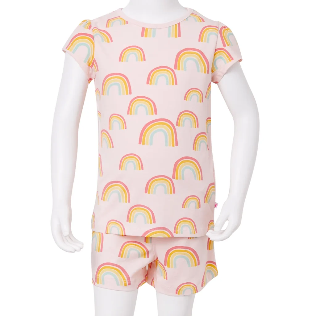 See laste pidžaama ühendab pehme puuvillase kanga, mugava lõike ja rõõmsa disaini, muutes selle sobivaks igapäevaseks magamisriideks 5–6 aastasele lapsele. Heleroosa värv ja vikerkaaretrükk pakuvad lapsele silmailu, samal ajal kui lühikesed varrukad ja püksid hoiavad keha ülekuumenemise eest. Kui otsid lihtsasti hooldatavat ja lapsele mugavat pidžaamat, on see komplekt praktiline ja läbimõeldud valik.