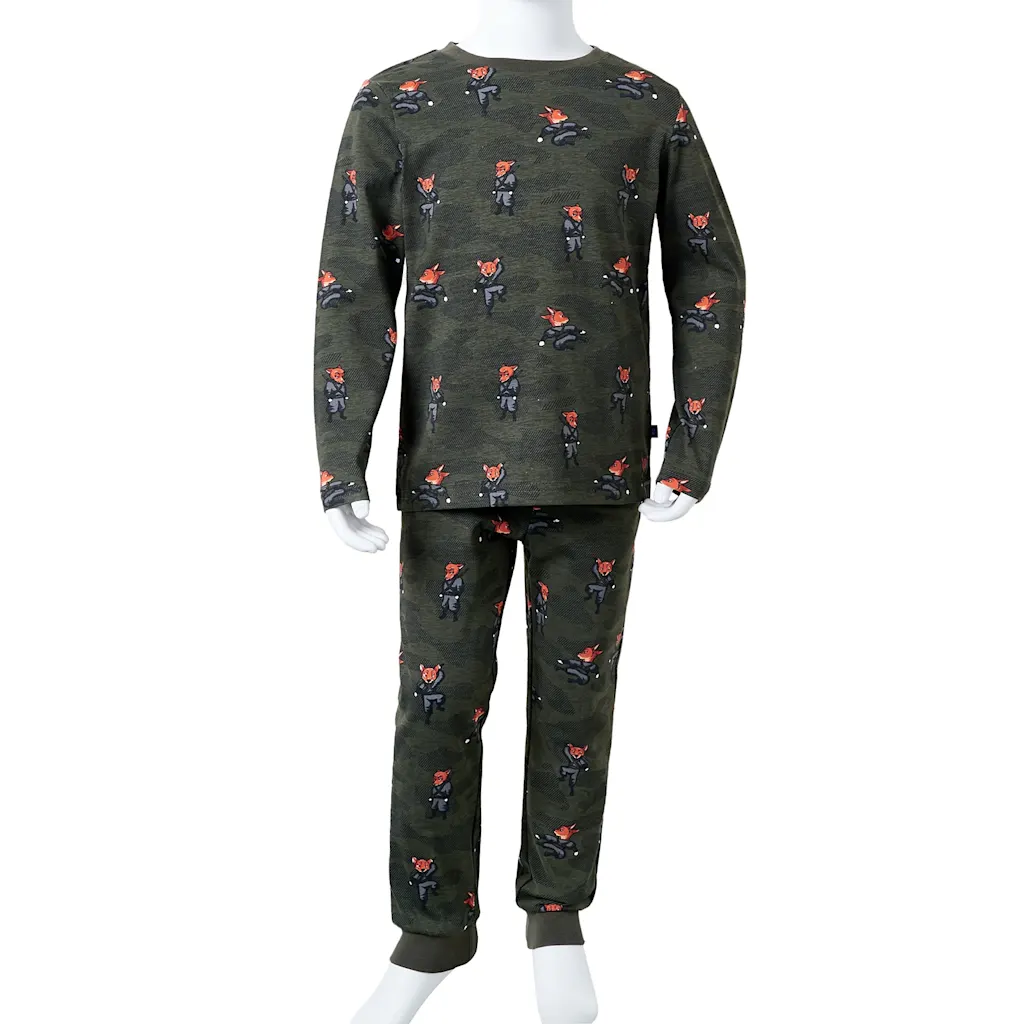 Komplekti kuulub pikkade varrukatega pidžaamasärk ja veniva vöökohaga pidžaamapüksid sama ninja rebase mustriga, mõlemad khaki rohelises toonis suuruses 140 (sobib 9–10-aastasele).