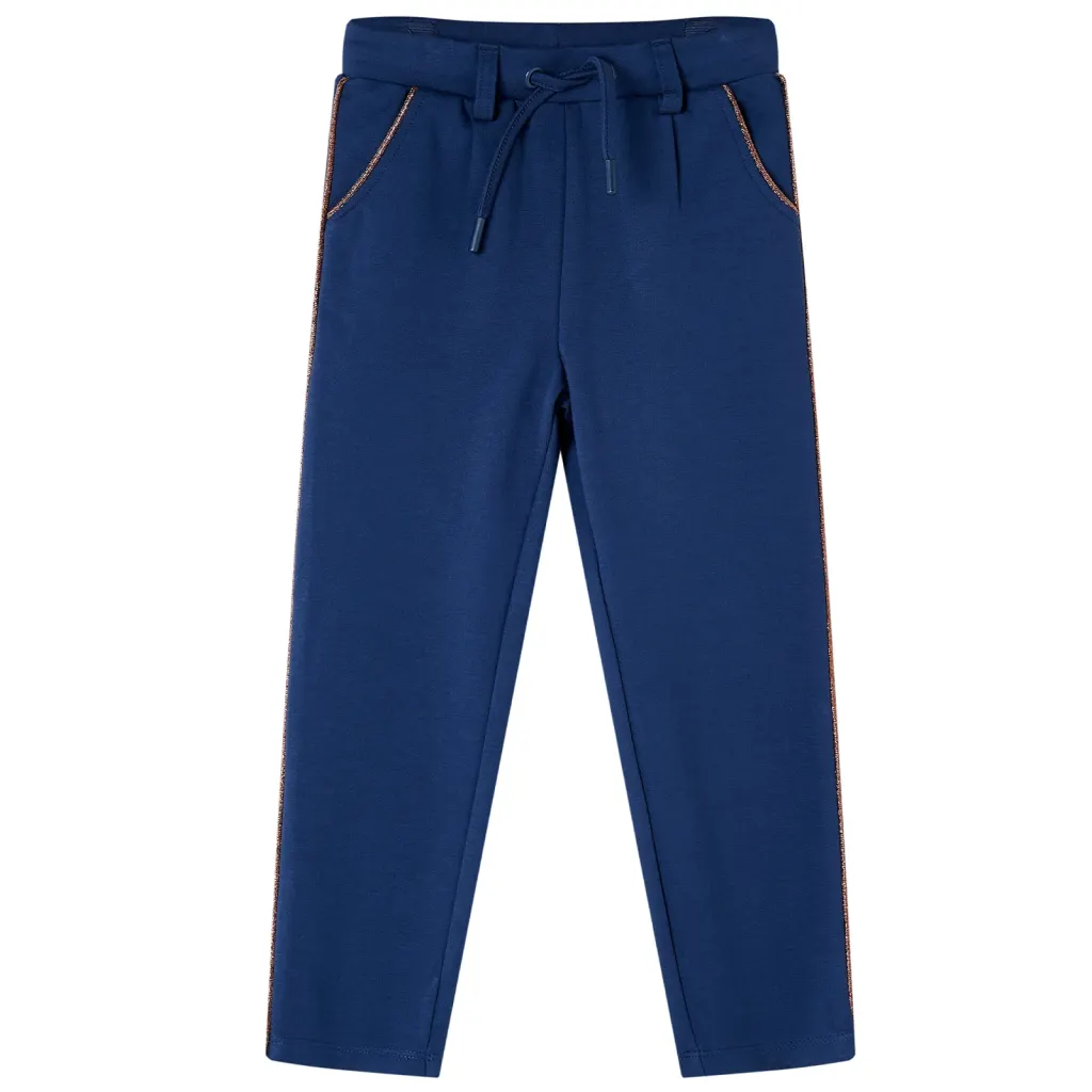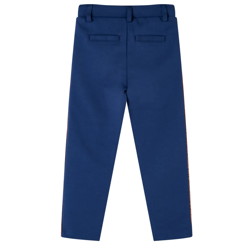 Need tumesinised laste püksid suurusele 128 ühendavad elastse vöökoha, praktilised taskud ja tumekuldsed dekoratiivsed triibud. Need sobivad hästi nii lasteaeda ja kooli kui ka vaba aja tegevusteks.